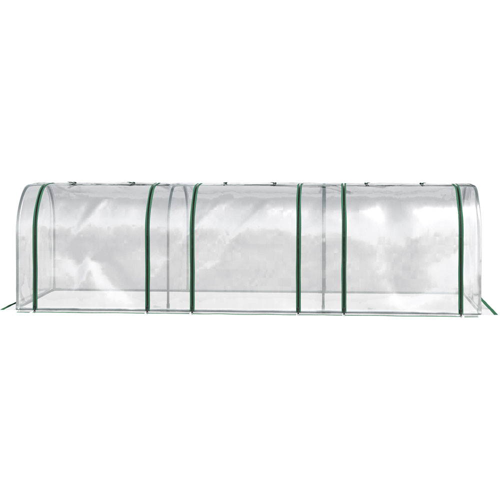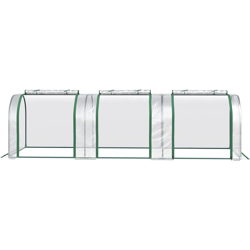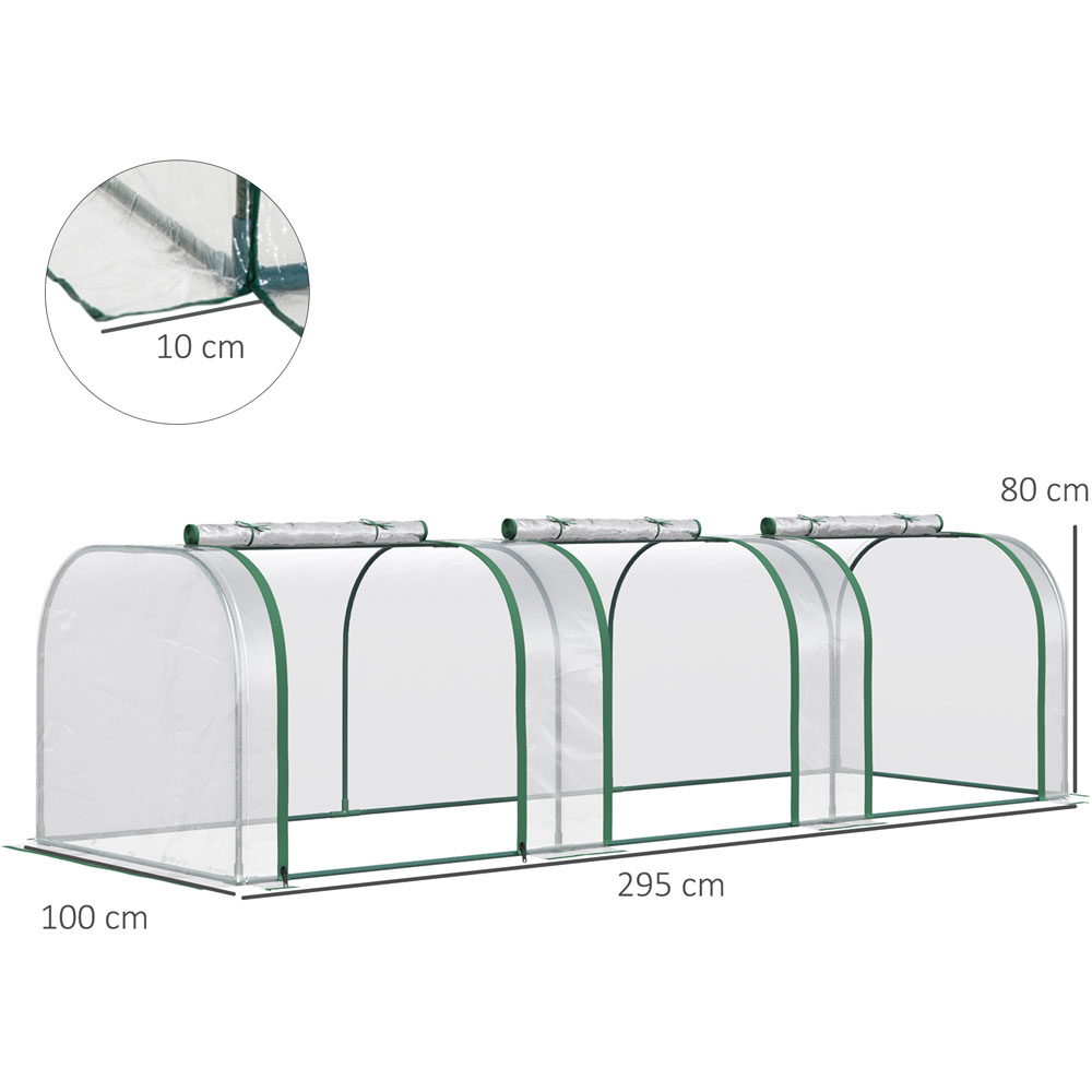 Grow plants, vegetables, fruit and flowers safely all year round with this long PVC Clear Tunnel Greenhouse from Outsunny. With a powder coated steel frame for strength and durability, it features a durable cover, helping to protect plants from cold, whilst providing plenty of sunlight for them to nourish and grow. The cover also features zipped doors, providing you easy access and ventilation throughout. Lightweight enough to be moved around, this greenhouse is perfect for gardens, patios, balconies and allotments. Not suitable for bad weather conditions. Assembly required. Overall Dimension: L 295 x W 100 x H 80cm. Redundant Cover Width: 10cm. Door Size: L 115 x W 73cm. Windproof: Level 4 (wind speed below 28km/h).
