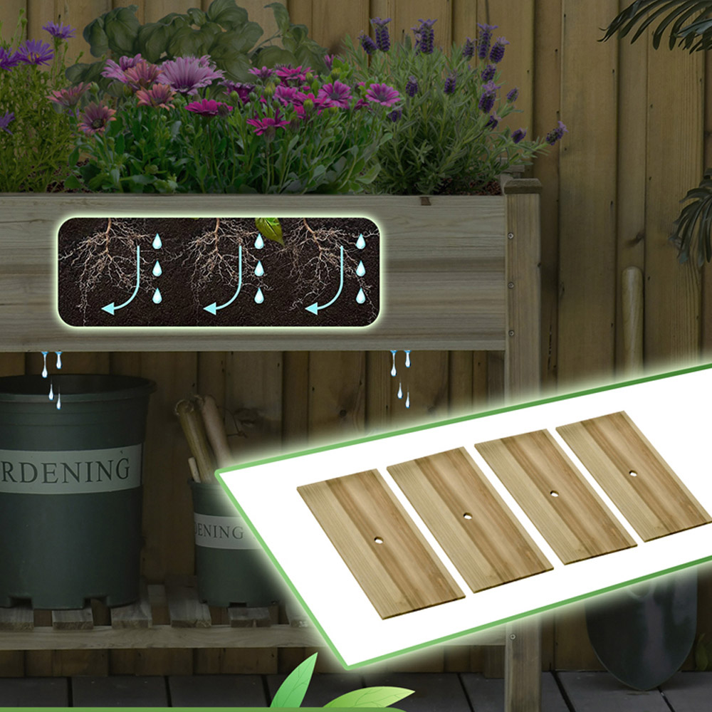 Make room for natural beauty in your garden with the Outsunny Raised Garden Bed with Legs. Featuring a two-tier design, the planter ensures plenty of space for plants to grow and flourish. The elevated 76cm height also limits stretching or bending and prevents infestation of bugs, insects and pets. Made from a strong fir wood frame, the classic planter comes with thick legs to ensure proper stability on the ground and has a lower storage shelf to keep gardening essentials. Apart from this, it also has four drainage holes that provide oxygen and ventilation for your plants.