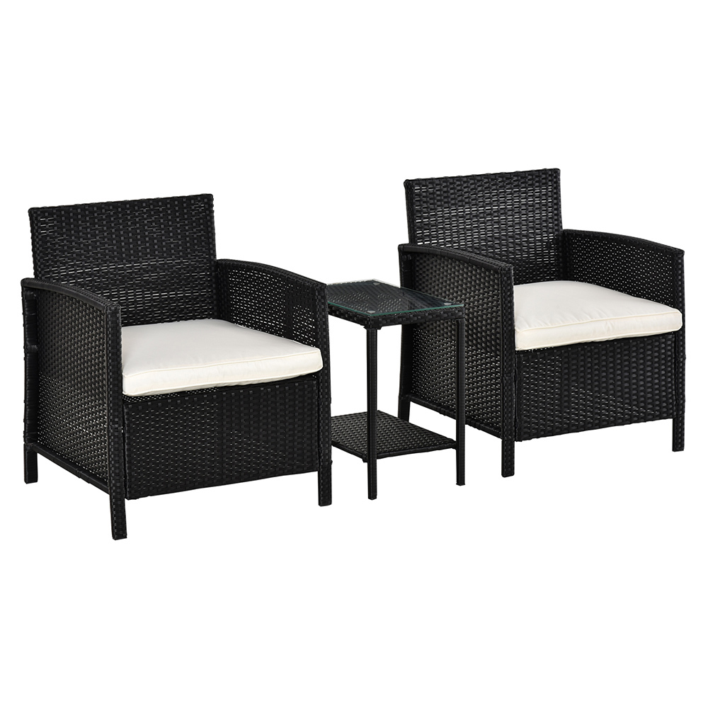 Make the right choice for the upcoming Summer season – choose this three-piece dining set from Outsunny for endless hours of comfort and joy. The garden bistro set for two, made of powder-coated, rust-resistant steel, ensures a strong and stable base. The PE wicker makes it sturdy, durable, easy to clean and resistant to UV and light water damage. The rattan two chairs and table set are placed with thick cushions on the seat for prolonged comfort, with removable and washable covers to keep them clean. And a stylish striped bolster cushion on each seat for extra comfort and support. The set is completed with a matching two-tier table, with a tempered glass top for a chic finishing touch. This garden bistro set featuring two wide armchairs and a matching coffee table is perfect for relaxing under the sun with someone, in your garden, on your patio, on the balcony etc. Protect your garden furniture with our durable and waterproof covers. Explore our wide range of heavy-duty
