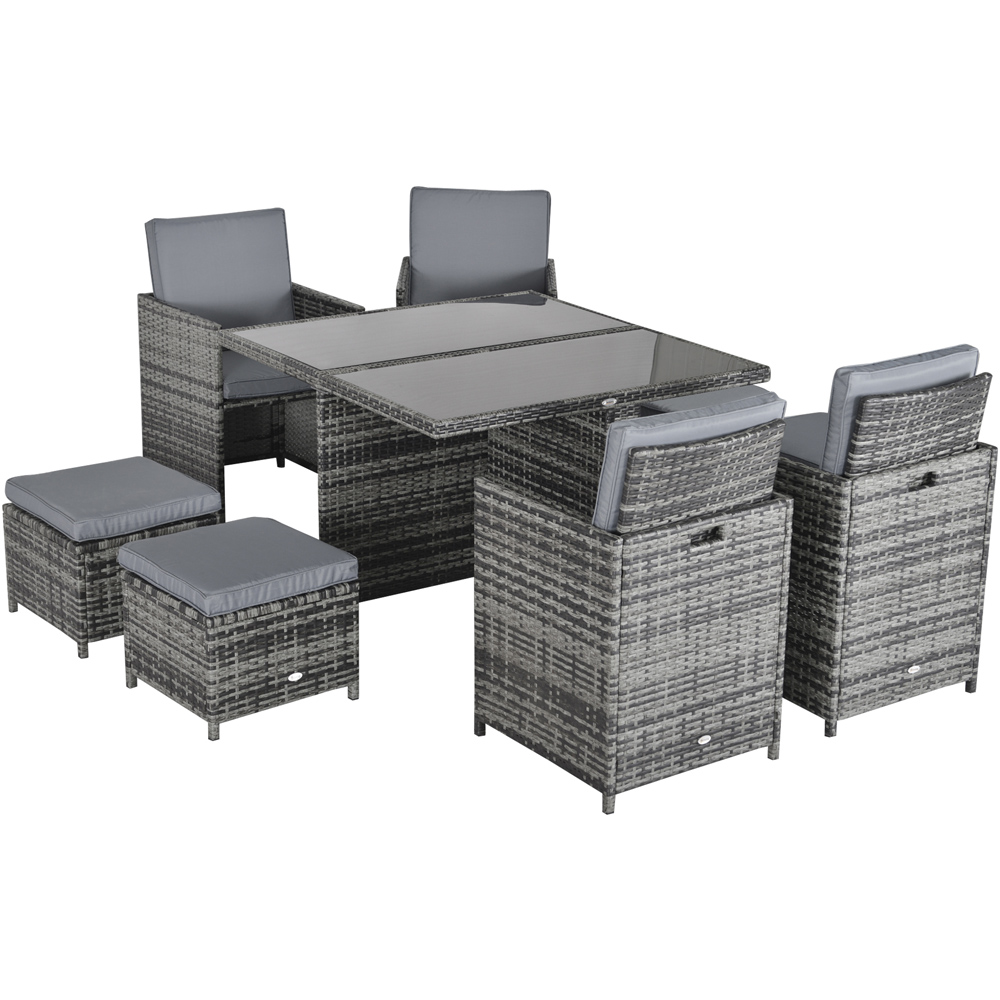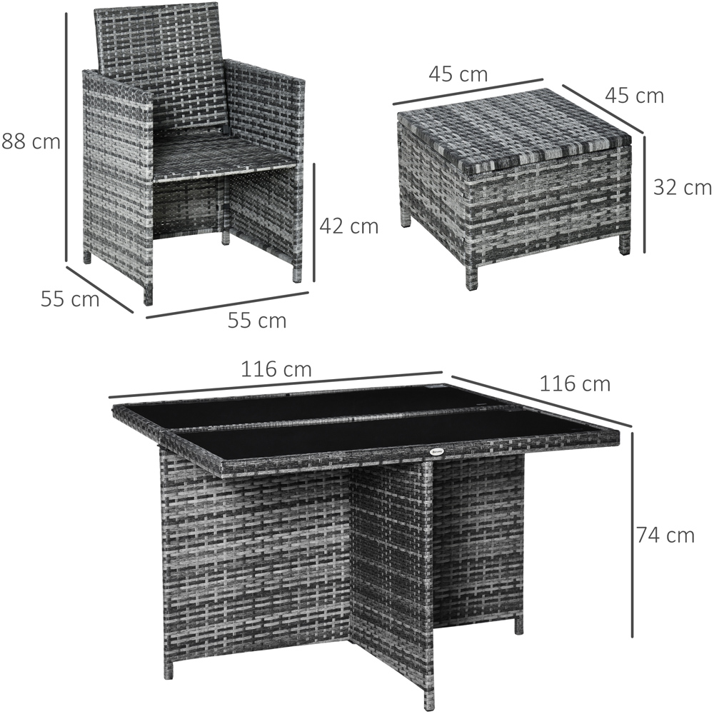 Enjoy dining under the stars on this Outsunny Rattan 8-Seater Garden Dining Set. This grey rattan set is suitable for use on any occasion. Its wicker and tempered glass table combination looks fashionable and creates a modern style for your living area. Also, it complements a range of outdoor space for you. Featuring a space-saving design, the chairs and stools nest neatly under the table for compact storage when not in use. Plus, it has a strong and supportive core with protective plastic wrap on top. For comfort, the rattan table, chairs and stools come complete with cushions for you to sink into easily. This set includes four armchairs, four footstools and a dining table. Protect your garden furniture with our durable and waterproof covers. Explore our wide range of heavy-duty Garden Furniture covers to find the perfect fit for your needs.