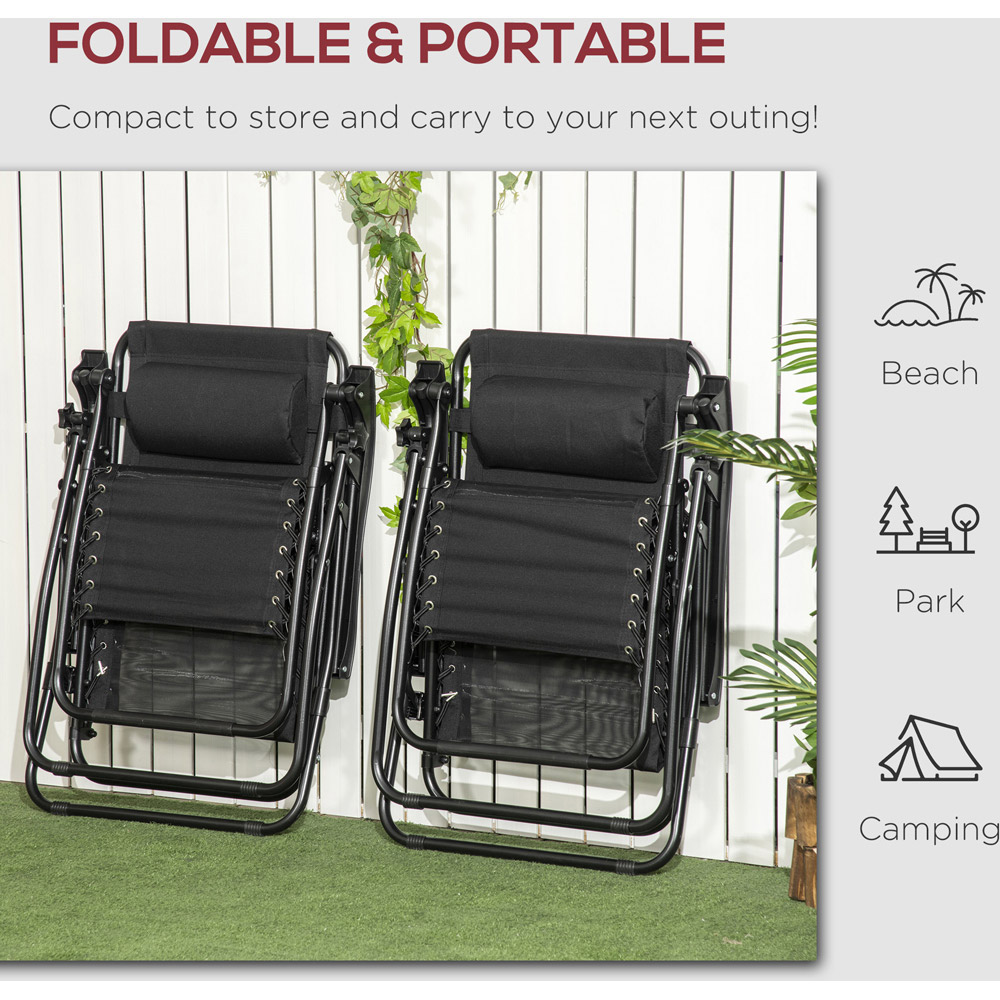 It's time to lounge and relax with Outsunny Zero Gravity Foldable Garden Recliner Chairs. This set of two black zero-gravity chairs elevates the body in a comfortable position for you to soak up the sun all afternoon long. Durable and sturdy, their powder-coated steel frame has a strong core for long-lasting use. Featuring a foldable design, you can easily carry them or store them away when not needed. Comfortable to use, the chairs come with a fabric seat with a padded top pillow to rest your head. Also, the back is freely adjustable to any angle you want - with a lock to fix the chosen position safely. Plus, the in-built footrests ensure that comfort is not compromised.