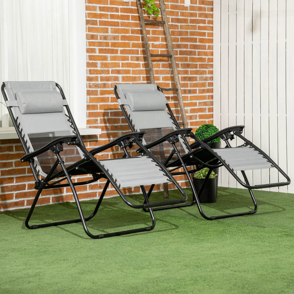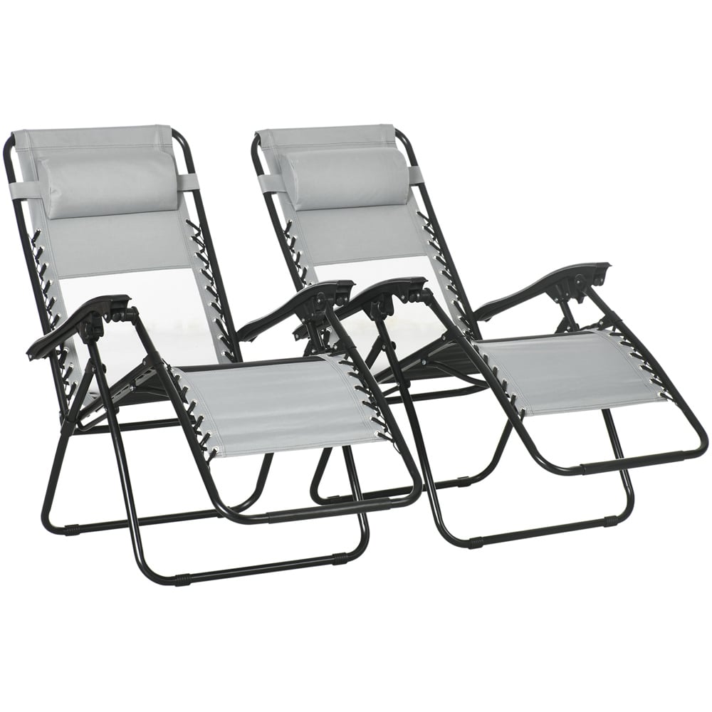It's time to lounge and relax with Outsunny Zero Gravity Foldable Garden Recliner Chairs. This set of two grey zero-gravity chairs elevates the body in a comfortable position for you to soak up the sun all afternoon long. Durable and sturdy, their powder-coated steel frame has a strong core for long-lasting use. Featuring a foldable design, you can easily carry them or store them away when not needed. Comfortable to use, the chairs come with a fabric seat with a padded top pillow to rest your head. Also, the back is freely adjustable to any angle you want - with a lock to fix the chosen position safely. Plus, the in-built footrests ensure that comfort is not compromised.