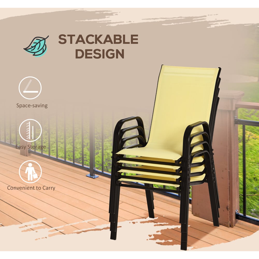 Relax outdoors with a friend, thanks to this Set of Four Beige Stackable Outdoor Dining Chairs from Outsunny. These chairs feature an ergonomic design with a high back and armrests to support your body, complemented by comfortable, breathable mesh fabric. The stackable design makes it compact for easy storage when not in use. These four stackable outdoor chairs are perfect for relaxing with friends on the patio, balcony, and more. Protect your garden furniture with our durable and waterproof covers. Explore our wide range of heavy-duty Garden Furniture covers to find the perfect fit for your needs.
