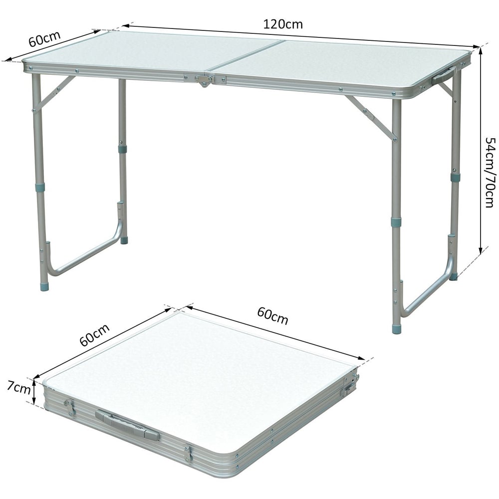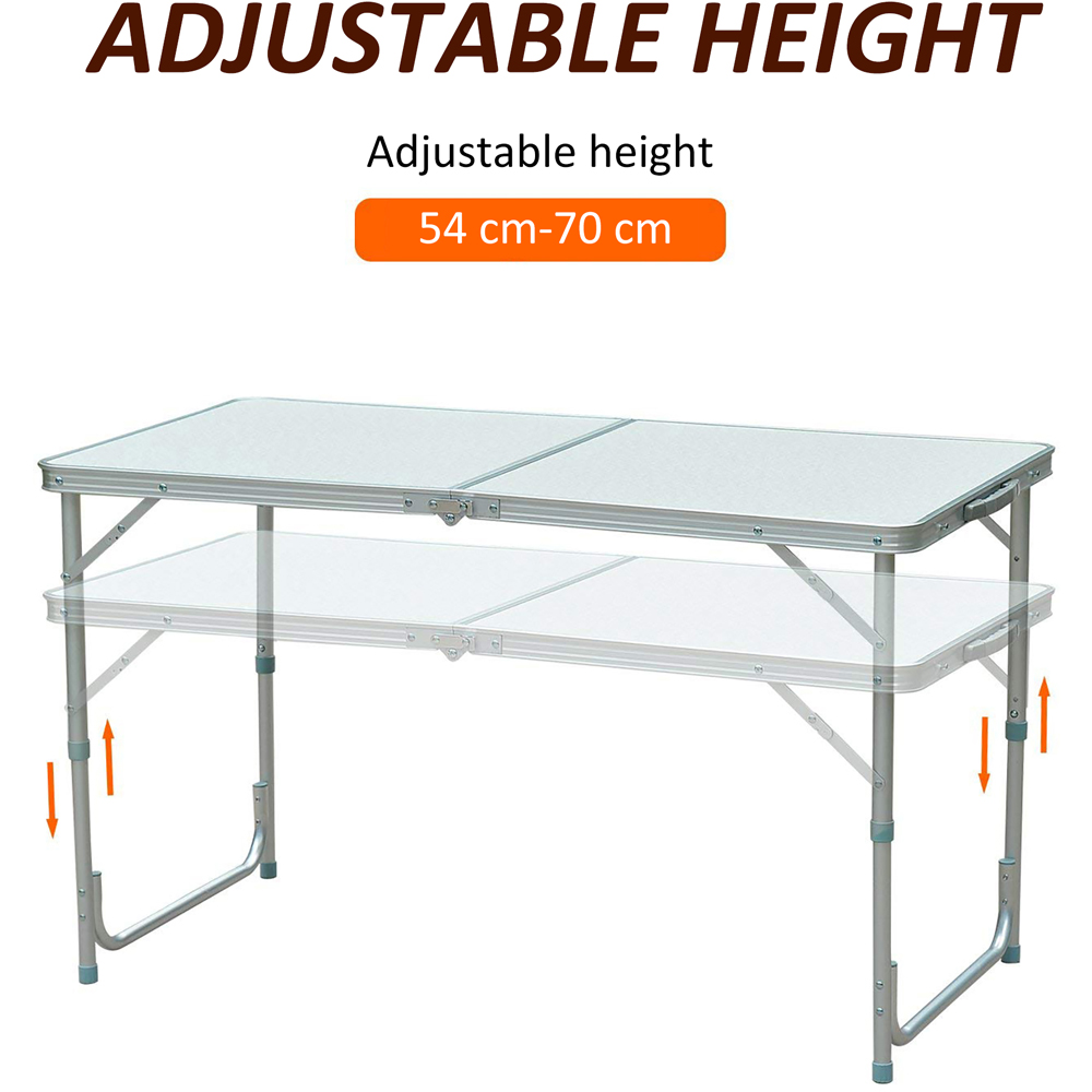 Perfect for tailgating, camping, or any special occasion, the Outsunny Silver Aluminium Foldable Picnic Table is ready wherever you are. Featuring an EZ carry handle, this table even folds up for compact storage. Made of lightweight aluminium and laminated top, this table is easy to tote around, set up, and clean. You can use them for a small group or line them up endlessly to create a long buffet-style table. It is lightweight, so you can easily carry it long distances. It also has adjustable legs, allowing for two height settings at 54cm and 70cm. Just push the release buttons and pull the legs out.