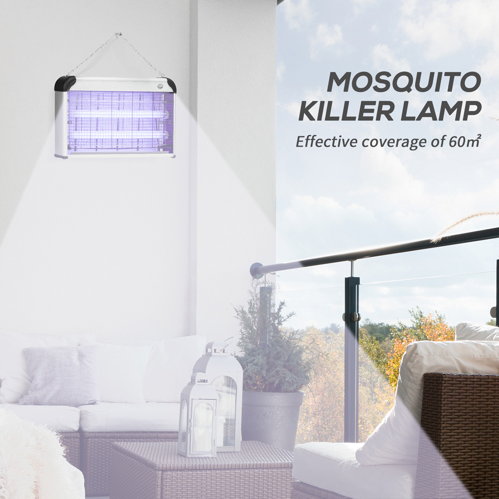 Keep the fly away from your space with Outsunny Silver Electric Fly Killer 30W. The portable mosquito killer lamp is energy-efficient, non-radiative, noiseless and odourless, effectively protecting you against mosquitoes, flies and other pests. The fully enclosed protective screening avoids accidental electric shocks. With 30W high efficiency and 60㎡ effective room coverage, it helps create a more effectively protected space by being mounted on the wall or ceiling with the hanging chain. The functional mosquito killer lamp is an ideal addition to your gardens, decks, balconies and more.