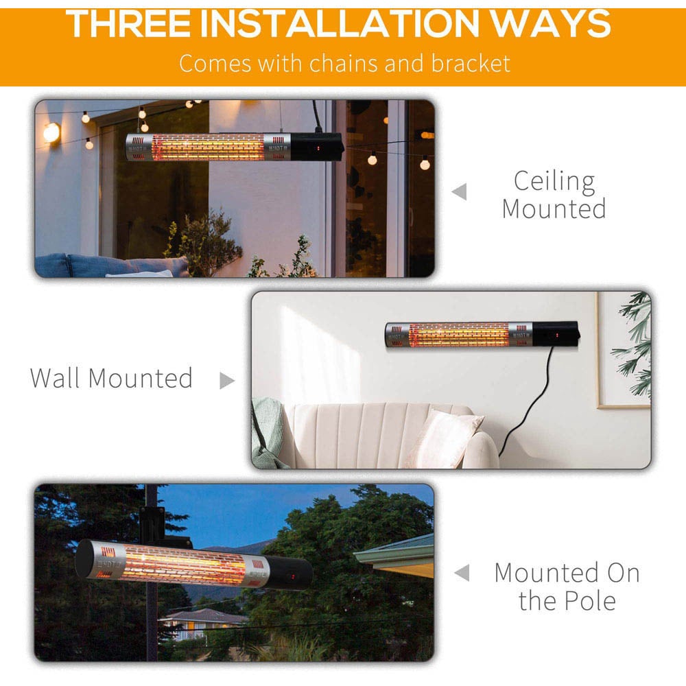 Make your alfresco-style events more comfortable with this Outsunny Wall Mounted Electric Infrared Halogen Heater with Remote 1500W. This outdoor electric heater with a power of 1500W is perfect for outdoor gatherings on chilly evenings. Its powerful halogen heating element quickly and efficiently distributes heat, providing both warmth and light. The hanging patio heater can be installed on the ceiling using cables or mounted on a wall with the supplied bracket. It comes with a remote control and an ON/OFF switch on the heater for easy operation. The remote control has an effective distance of up to five meters. The garden heater is IP66-rated, making it suitable for both indoor and outdoor use. It is a great addition to any BBQ, party, or outdoor activity. Easy to install on a wall or pole.