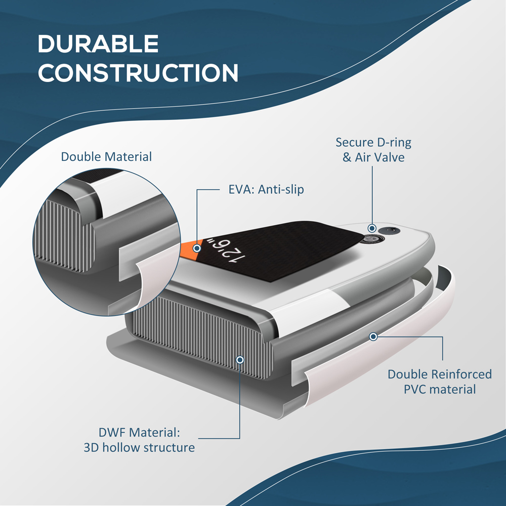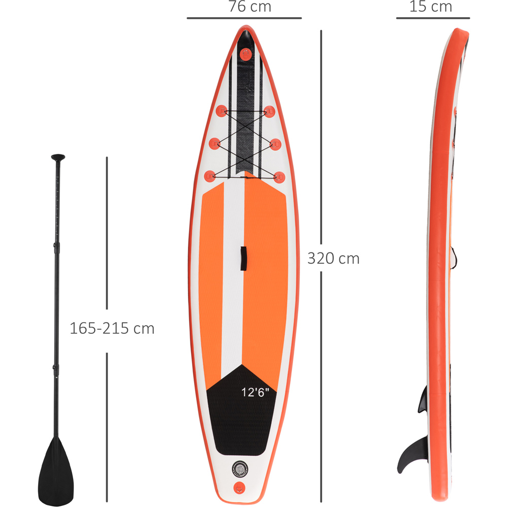 Make your time at the beach more fun with this Outsunny White and Orange Inflatable Stand Up Paddle Board 10ft 6 inch. With an inflatable and foldable design, it can be deflated and carried along easily. The non-slip EVA offers extra grip and the D-shape buckle and rope keep you secured to the paddle board. This paddle board features removable fins that allow you to move forward in a straight line. It also comes with an adjustable aluminium paddle that can suit different heights. This set includes an adjustable aluminium paddle, an air pump, a backpack, three back fins, and a repair kit.