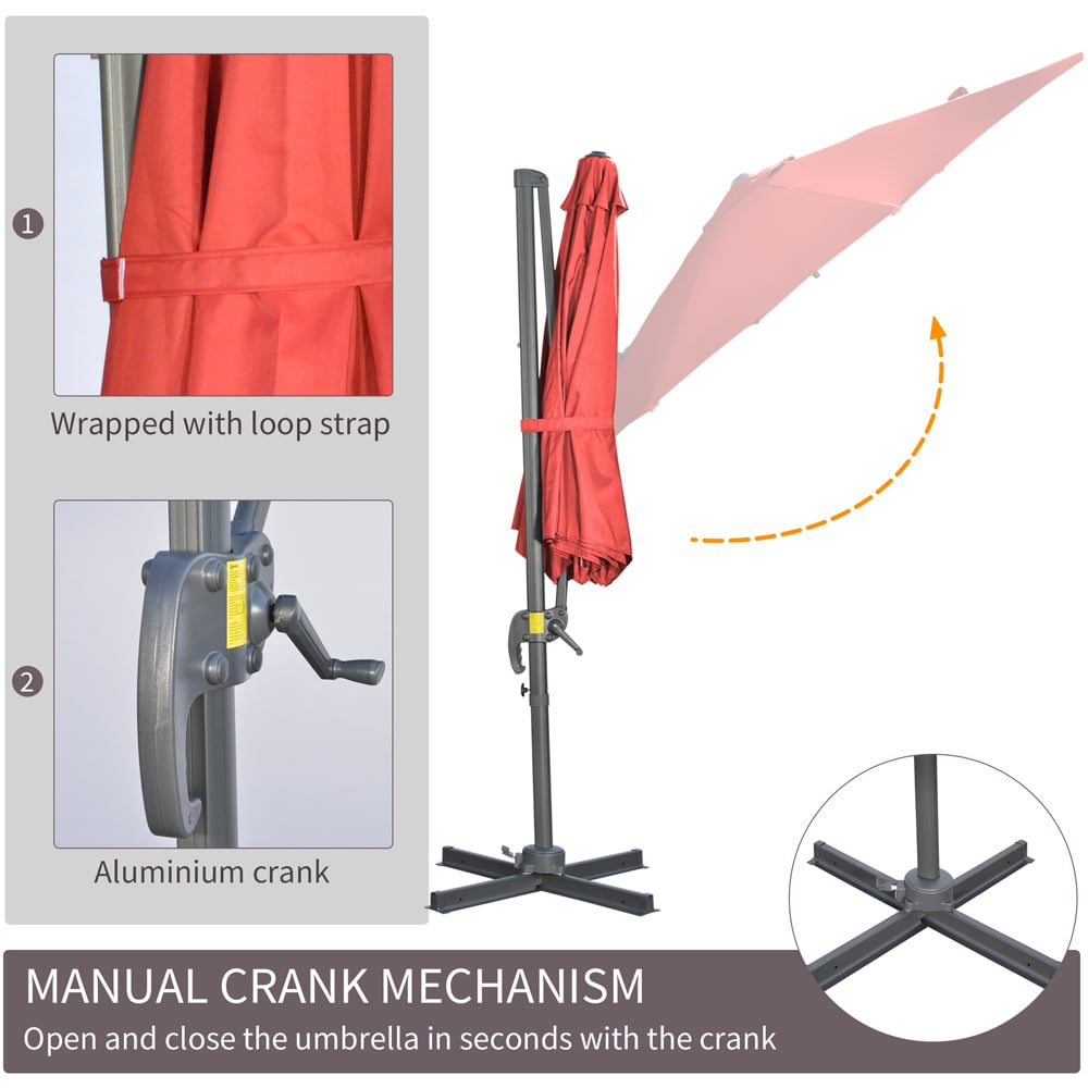 Stay protected while enjoying the sun with the Outsunny 3 x 3m Wine Red Cantilever Parasol with Cross Base. Featuring a robust aluminium frame and eight metal ribs for added support, this parasol ensures durability and stability. The canopy can be adjusted to five different angles and rotates a full 360 degrees, allowing you to position the shade exactly where you need it. The crank handle makes opening and closing effortless. It comes complete with a cross base, though weights are required for added stability. Perfect for creating a comfortable and shaded outdoor space.