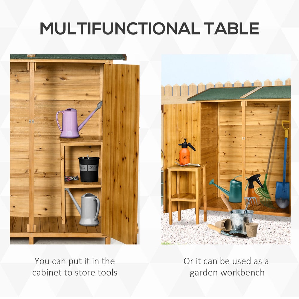 Looking for a compact storage solution for your small and lovely garden? This Outsunny Wooden Garden Storage Shed Cabinet with Asphalt Roof is your ideal choice. It comes in a compact, tall and narrow vertical design. The shed includes a removable table which can used as an extra or brought out for separate use. It also features a slanted asphalt roof to prevent water build-up and has a protective paint coat for added protection and durability.