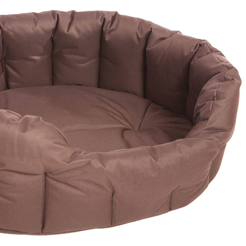 Give your beloved dog a comfortable and luxurious place to sleep with P&L Jumbo Brown Oval Waterproof Dog Bed. This heavy-duty oval waterproof drop-fronted soft bed is the ideal dog bed for Country Dogs who get wet and dirty on a regular basis. The bed is covered in a heavy-duty, hard-wearing, 100% polyester waterproof material treated with a water-repellent coating, which is easy to keep clean. Brush off loose dirt, wipe with a wet cloth and then rinse under a running tap/hose or a low setting on a pressure washer. It's designed to keep your pet warm and comfortable. The thick base cushion (removable for easy separate cleaning) and the high walls of this bed are filled with bonded Thermal Polyester Fibre to insulate your pet from the cold floor and keep it out of draughts. Available in three sizes and seven colourways. Size: Medium H22 x W51 x L61cm / Base Cushion 7cm thickness. Size: Large H24 x W64cm x L76cm / Base Cushion 8cm thickness. Size: Jumbo H25 x W74 x L90cm / Base Cushion 8cm thickness. (All measurements given are Internal and subject to slight variations due to the manufacturing process).