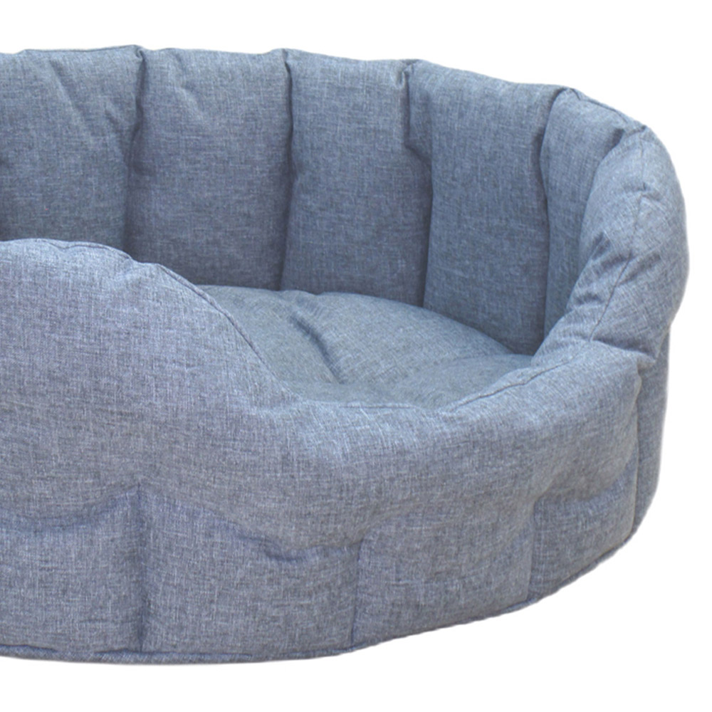 Give your beloved dog a comfortable and luxurious place to sleep with P&L Jumbo Charcoal Oval Waterproof Dog Bed. This heavy-duty oval waterproof drop-fronted soft bed is the ideal dog bed for Country Dogs who get wet and dirty on a regular basis. The bed is covered in a heavy-duty, hard-wearing, 100% polyester waterproof material treated with a water-repellent coating, which is easy to keep clean. Brush off loose dirt, wipe with a wet cloth and then rinse under a running tap/hose or a low setting on a pressure washer. It's designed to keep your pet warm and comfortable. The thick base cushion (removable for easy separate cleaning) and the high walls of this bed are filled with bonded Thermal Polyester Fibre to insulate your pet from the cold floor and keep it out of draughts. Available in three sizes and seven colourways. Size: Medium H22 x W51 x L61cm / Base Cushion 7cm thickness. Size: Large H24 x W64cm x L76cm / Base Cushion 8cm thickness. Size: Jumbo H25 x W74 x L90cm / Base Cushion 8cm thickness. (All measurements given are Internal and subject to slight variations due to the manufacturing process).