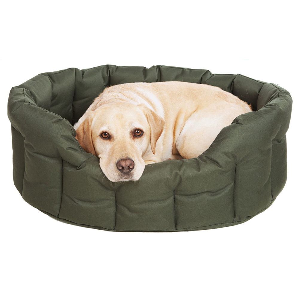 Give your beloved dog a comfortable and luxurious place to sleep with P&L Jumbo Green Oval Waterproof Dog Bed. This heavy-duty oval waterproof drop-fronted soft bed is the ideal dog bed for Country Dogs who get wet and dirty on a regular basis. The bed is covered in a heavy-duty, hard-wearing, 100% polyester waterproof material treated with a water-repellent coating, which is easy to keep clean. Brush off loose dirt, wipe with a wet cloth and then rinse under a running tap/hose or a low setting on a pressure washer. It's designed to keep your pet warm and comfortable. The thick base cushion (removable for easy separate cleaning) and the high walls of this bed are filled with bonded Thermal Polyester Fibre to insulate your pet from the cold floor and keep it out of draughts. Available in three sizes and seven colourways. Size: Medium H22 x W51 x L61cm / Base Cushion 7cm thickness. Size: Large H24 x W64cm x L76cm / Base Cushion 8cm thickness. Size: Jumbo H25 x W74 x L90cm / Base Cushion 8cm thickness. (All measurements given are Internal and subject to slight variations due to the manufacturing process).