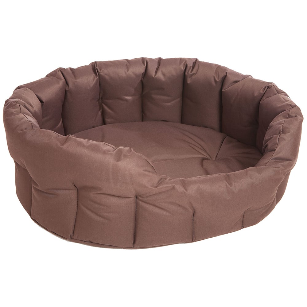 Give your beloved dog a comfortable and luxurious place to sleep with P&L Large Brown Oval Waterproof Dog Bed. This heavy-duty oval waterproof drop-fronted soft bed is the ideal dog bed for Country Dogs who get wet and dirty on a regular basis. The bed is covered in a heavy-duty, hard-wearing, 100% polyester waterproof material treated with a water-repellent coating, which is easy to keep clean. Brush off loose dirt, wipe with a wet cloth and then rinse under a running tap/hose or a low setting on a pressure washer. It's designed to keep your pet warm and comfortable. The thick base cushion (removable for easy separate cleaning) and the high walls of this bed are filled with bonded Thermal Polyester Fibre to insulate your pet from the cold floor and keep it out of draughts. Available in three sizes and seven colourways. Size: Medium H22 x W51 x L61cm / Base Cushion 7cm thickness. Size: Large H24 x W64cm x L76cm / Base Cushion 8cm thickness. Size: Jumbo H25 x W74 x L90cm / Base Cushion 8cm thickness. (All measurements given are Internal and subject to slight variations due to the manufacturing process).