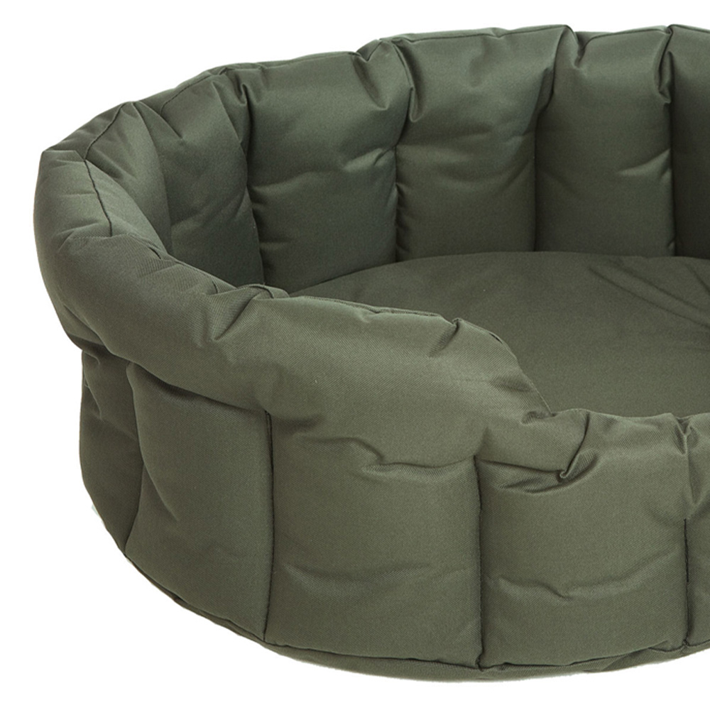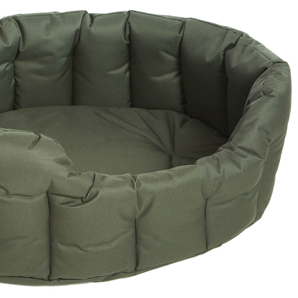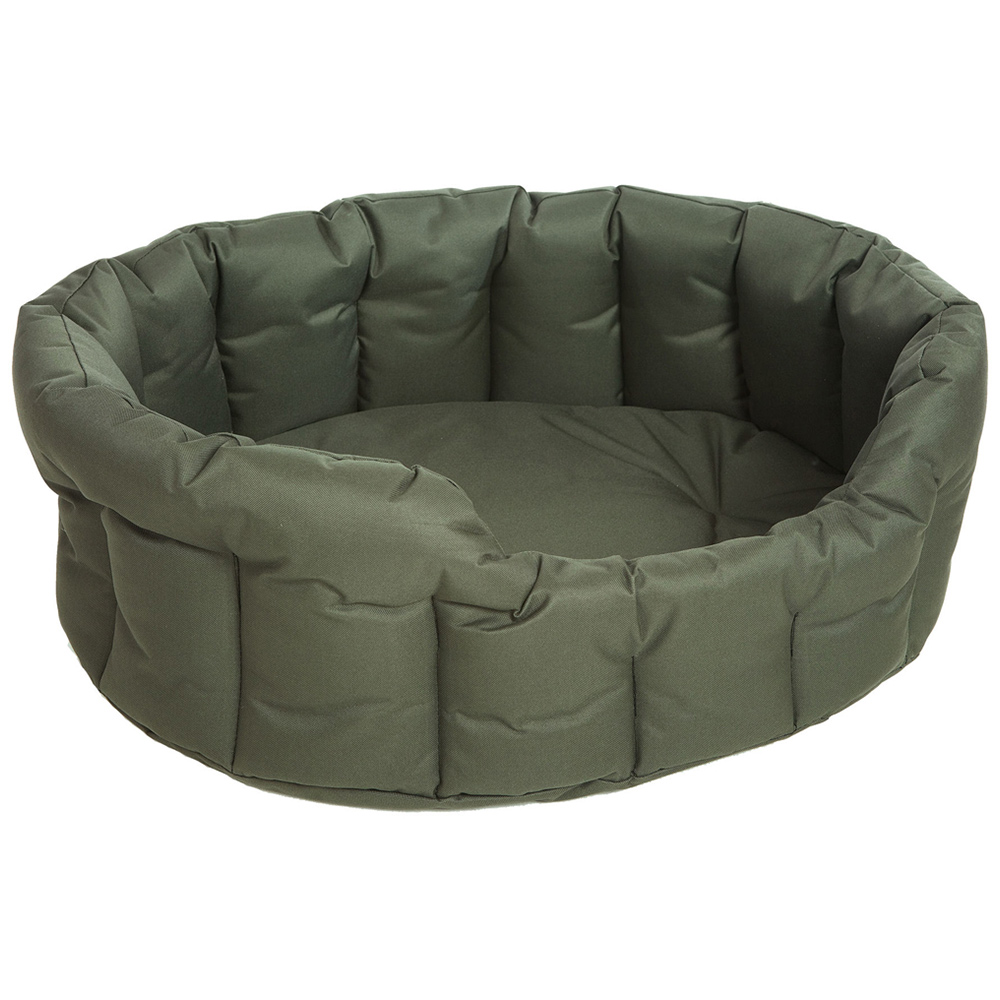 Give your beloved dog a comfortable and luxurious place to sleep with P&L Large Green Oval Waterproof Dog Bed. This heavy-duty oval waterproof drop-fronted soft bed is the ideal dog bed for Country Dogs who get wet and dirty on a regular basis. The bed is covered in a heavy-duty, hard-wearing, 100% polyester waterproof material treated with a water-repellent coating, which is easy to keep clean. Brush off loose dirt, wipe with a wet cloth and then rinse under a running tap/hose or a low setting on a pressure washer. It's designed to keep your pet warm and comfortable. The thick base cushion (removable for easy separate cleaning) and the high walls of this bed are filled with bonded Thermal Polyester Fibre to insulate your pet from the cold floor and keep it out of draughts. Available in three sizes and seven colourways. Size: Medium H22 x W51 x L61cm / Base Cushion 7cm thickness. Size: Large H24 x W64cm x L76cm / Base Cushion 8cm thickness. Size: Jumbo H25 x W74 x L90cm / Base Cushion 8cm thickness. (All measurements given are Internal and subject to slight variations due to the manufacturing process).