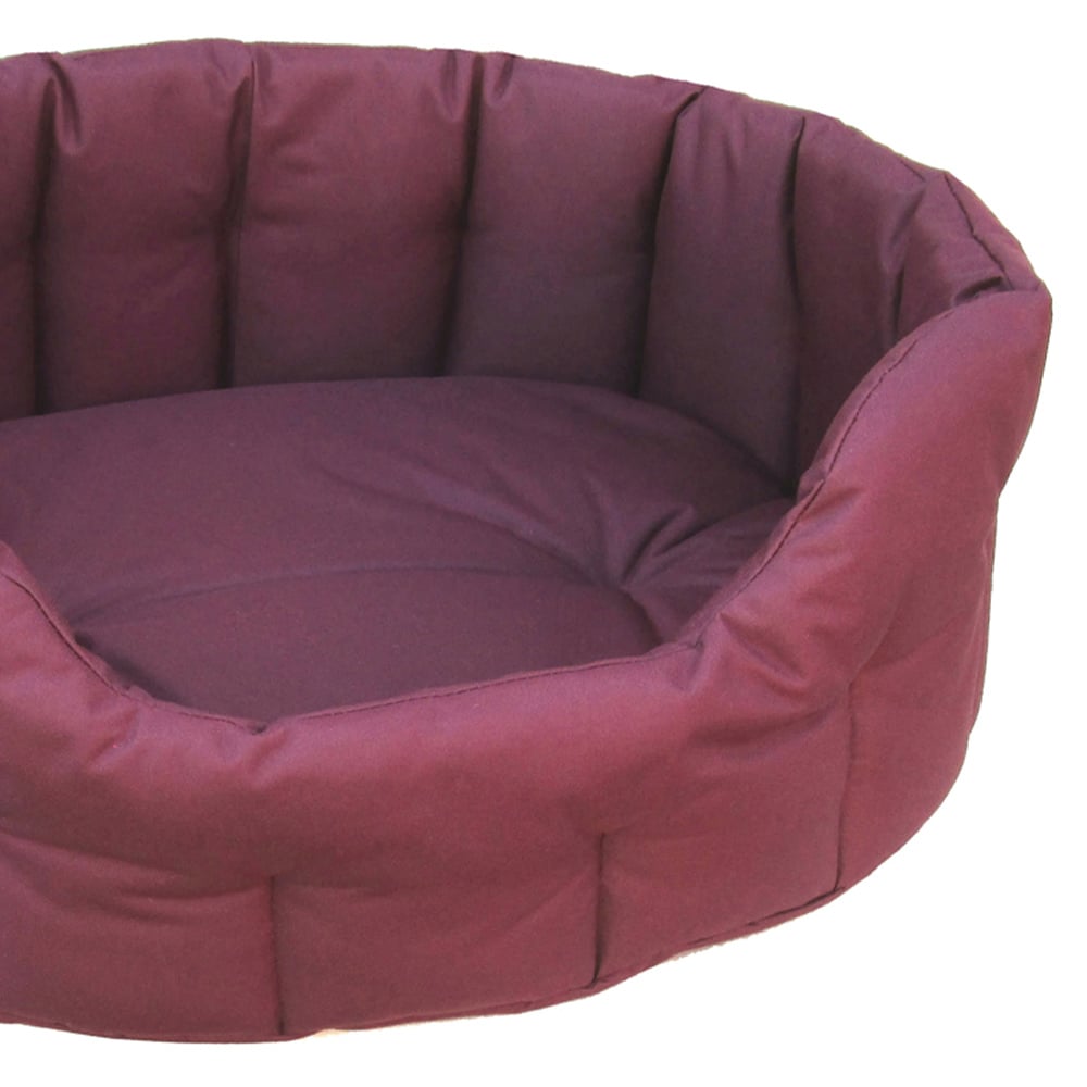 Give your beloved dog a comfortable and luxurious place to sleep with P&L Medium Burg Oval Waterproof Dog Bed. This heavy-duty oval waterproof drop-fronted soft bed is the ideal dog bed for Country Dogs who get wet and dirty on a regular basis. The bed is covered in a heavy-duty, hard-wearing, 100% polyester waterproof material treated with a water-repellent coating, which is easy to keep clean. Brush off loose dirt, wipe with a wet cloth and then rinse under a running tap/hose or a low setting on a pressure washer. It's designed to keep your pet warm and comfortable. The thick base cushion (removable for easy separate cleaning) and the high walls of this bed are filled with bonded Thermal Polyester Fibre to insulate your pet from the cold floor and keep it out of draughts. Available in three sizes and seven colourways. Size: Medium H22 x W51 x L61cm / Base Cushion 7cm thickness. Size: Large H24 x W64cm x L76cm / Base Cushion 8cm thickness. Size: Jumbo H25 x W74 x L90cm / Base Cushion 8cm thickness. (All measurements given are Internal and subject to slight variations due to the manufacturing process).