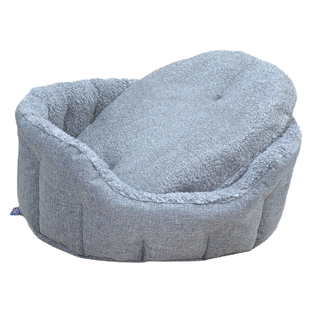P&L Small Charcoal Premium oval drop-fronted bolster-style dog bed is designed to provide comfortable and luxurious sleep for your dog. The outer material is hard-wearing 100% polyester, and the inner lining is a Soft Sherpa Fleece designed to keep your pet warm and comfortable. The thick base cushion, which is removable and the high walls of this bed are filled with bonded Thermal Non-Clumping Polyester Fibre to insulate your dog from the cold floor and keep it out of draughts. The P&L dog bed is designed and manufactured to be fully machine washable, keeping shape after washing. Available in three sizes. Size Intermediate H20 x W41 x L51cm / Base Cushion 7cm thickness. Size Medium H22 x W51 x L61cm / Base Cushion 7cm thickness. Size Large H24 x W64 x L76cm / Base Cushion 8cm thickness. Size Jumbo H25 x W74 x L90cm /Base Cushion 8cm thickness. All measurements given are Internal and subject to slight variations due to the manufacturing process.