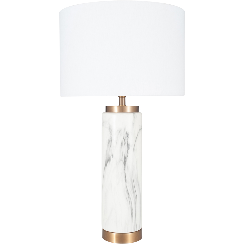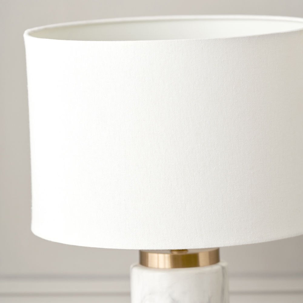 This modern tall ceramic table lamp with marble effect finish is complemented by the gold metal details offering a contemporary look. Topped with a white faux cotton shade this lamp will fit in most decor styles with its beautiful finish.