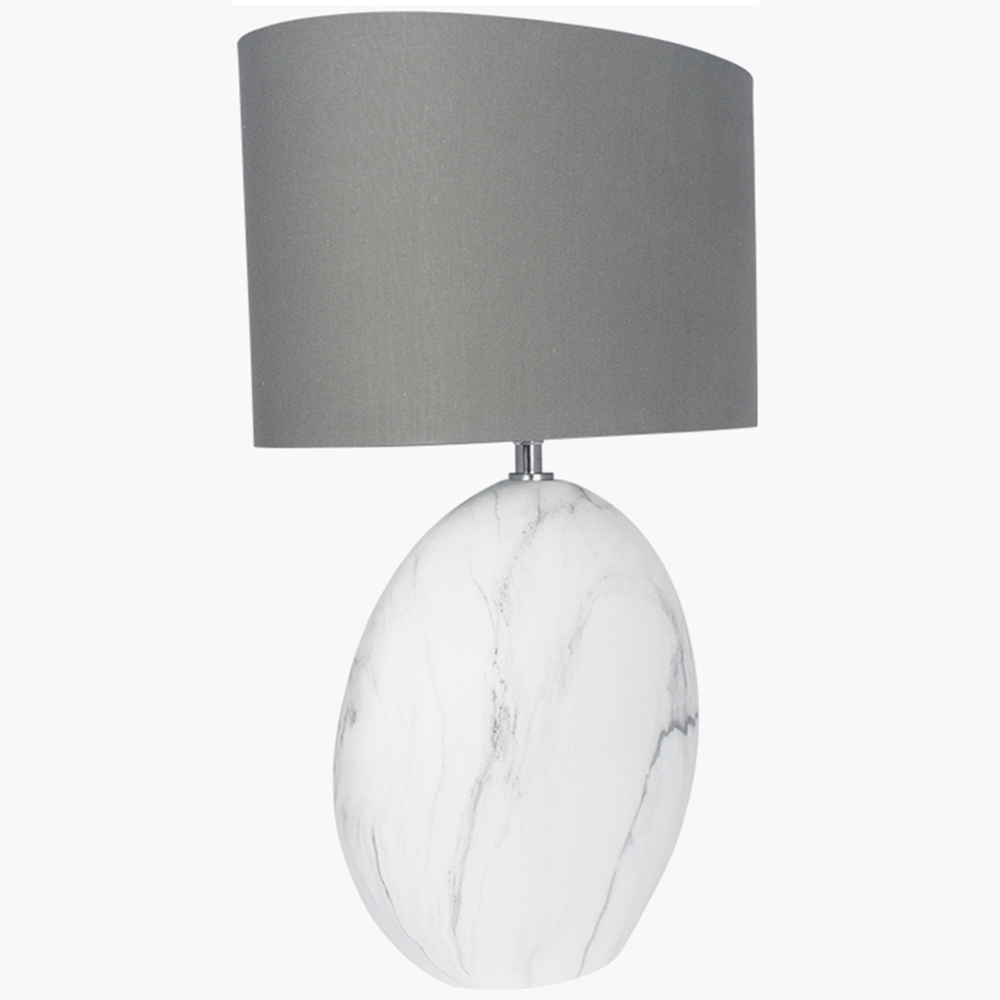 Who would believe this table lamp was ceramic and not marble! A very current marble effect ceramic table lamp, disc-shaped for that perfect console or shelf space crying out for some style! This lamp comes compete with a grey linen effect oval shade to complement it perfectly.