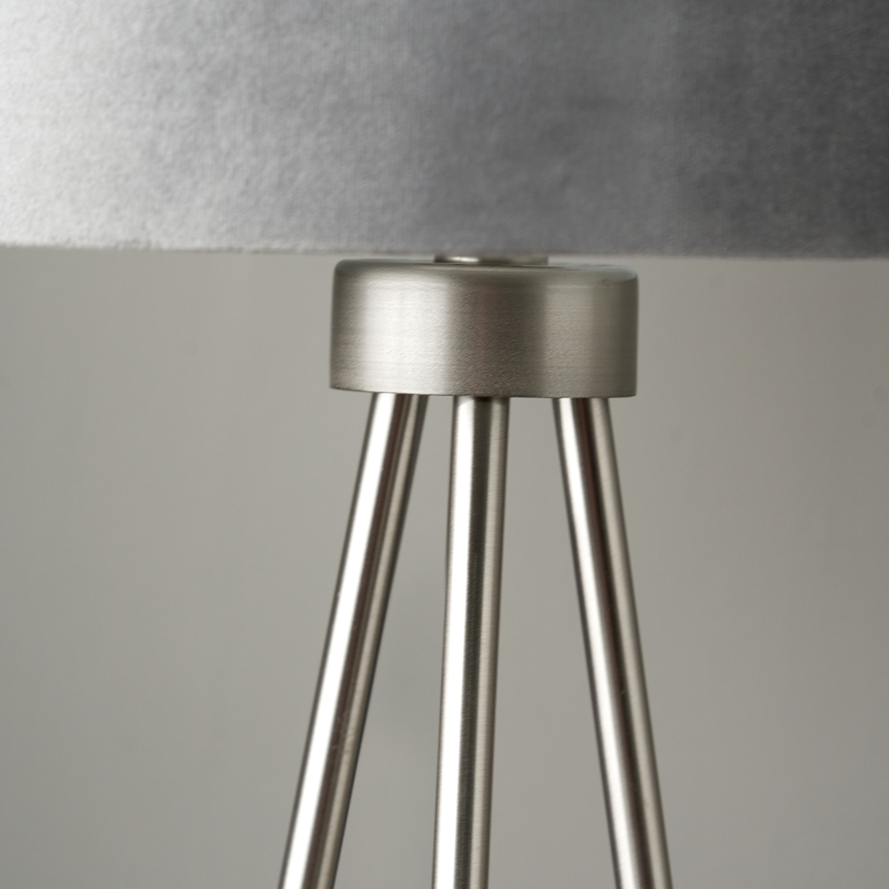 This contemporary tripod table lamp is a simple yet elegant style with slim legs and a brushed silver finish. The shade is a luxurious grey velvet lined in matching faux cotton adding sophisticated glamour to any room.