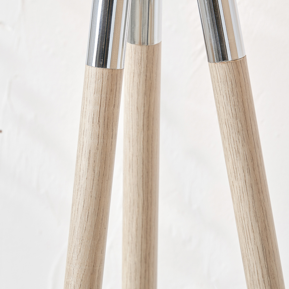 This contemporary tripod floor lamp is finished in a grey wood veneer and silver metal, is topped off perfectly with a crisp white lampshade. This floor lamp, featuring 3 slim legs, will slot easily into any interior space, offering an extra light source and sophisticated styling.
