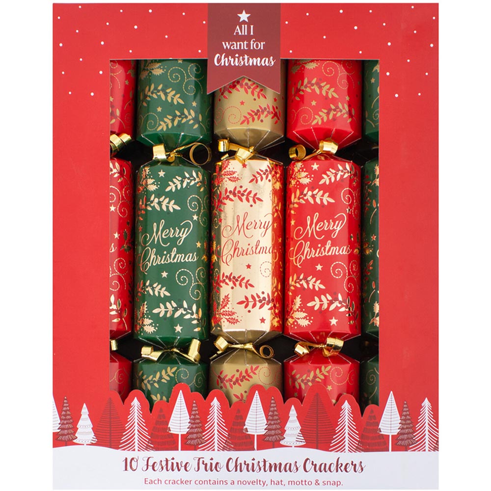 Elevate your holiday celebrations with the Pack of 10 Festive Trio Colour Crackers. Featuring a foliage and script design, these crackers are finished with gold ribbons for a classic touch. Each cracker offers a hat, snap, motto and gift to bring a sweet smile to your loved ones' faces. Ideal for any home, these crackers add extra fun and excitement to your parties.