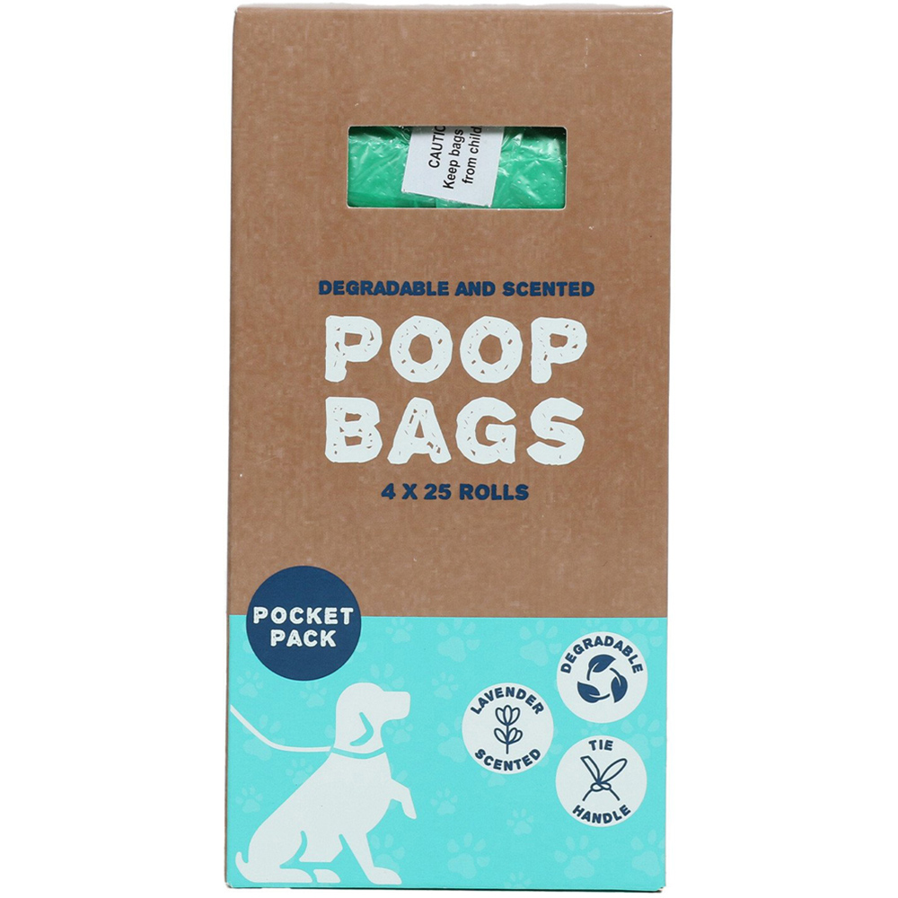 Cleaning up after your dog has never been so easy with this Pack of 100 Scented Degradable Poop Bags. The perfect size for putting in your pocket, these poo bags have a pleasant lavender scent and a tie handle to secure the mess.