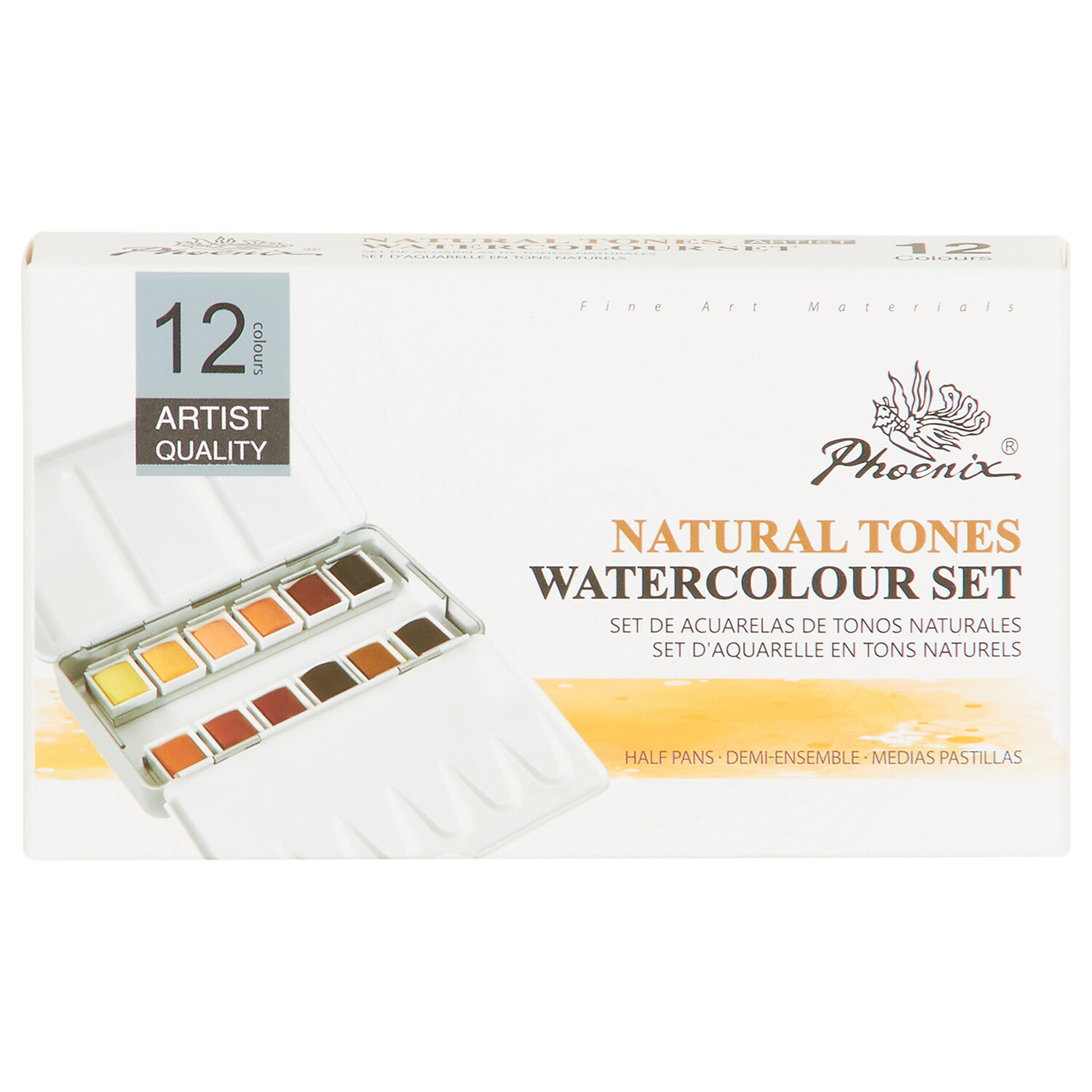 Get an easy, portable painting solution with the Pack of 12 Natural Tones Watercolour Set. It is perfect for artists of all levels, whether you're a seasoned painter or just starting out. Ideal for use at home or on the go, this pocket-sized travel tin contains a vibrant selection of richly pigmented natural tone paints.