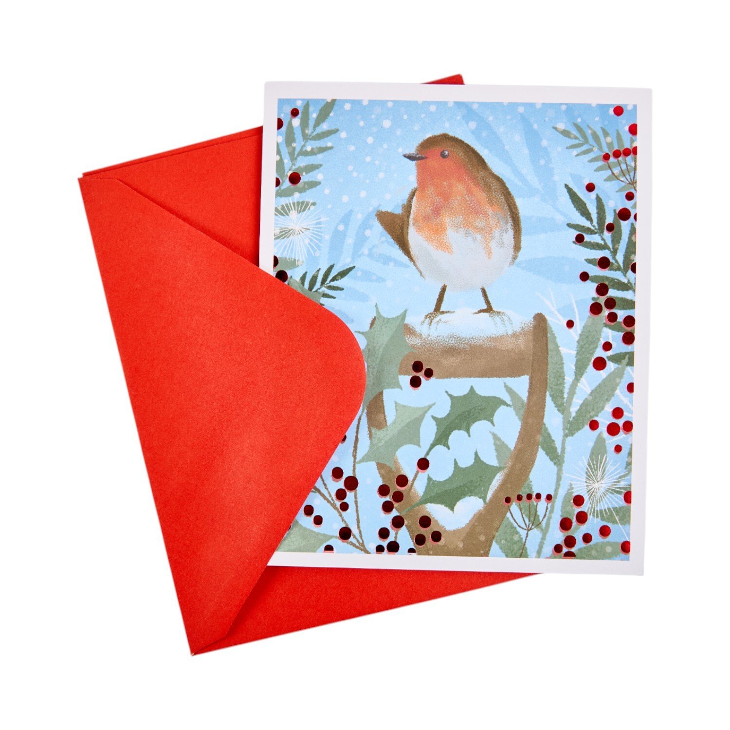 Share the warmth of the season with this Pack of 15 Christmas Robin Cards. Beautifully designed, each card features a charming robin accented with a red foil stamp and finished with a water-based varnish for a subtle, elegant touch. Complete with envelopes, they are perfect for sending heartfelt wishes to family and friends during the holiday season.