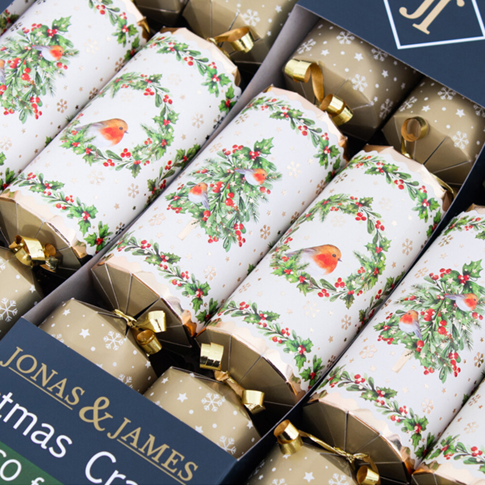 Make an elegant addition to your festive setting with the Pack of 16 Gold Wreath Crackers. These crackers are adorned with a woodland design and gold ribbon to add a touch of charm to any empty table. Inside them, there's a hat, motto, snap and gift. Perfect for enhancing your celebrations, they are sure to bring a smile to all your guests' faces.