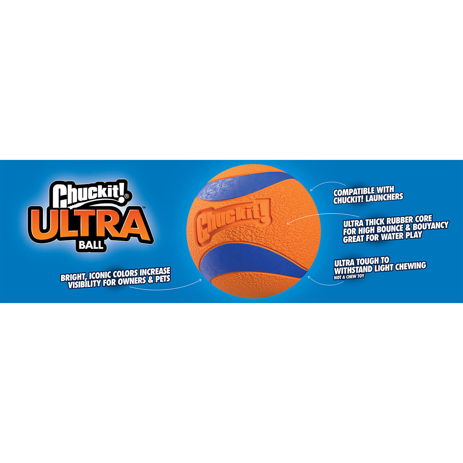 Keep your dog thoroughly entertained with this Pack of 2 Chuckit! Ultra Balls. These balls feature a thick natural rubber core and highly visible colour, making them easier to find in long grass or dimly lit areas. They are designed to be high bouncing so your pup can leap, jump, and stay active during playtime. Pair these balls with the Chuckit! Launcher to enjoy a longer game of fetch without the slobbery pickup.
