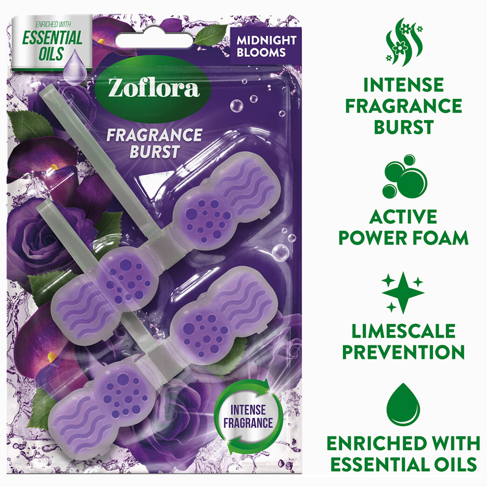 Keep your washroom fresh and clean with Zoflora Fragrance Burst Midnight Blooms Rim Block 48g 2 Pack. It is enriched with essential oils, and forms foam for powerful cleaning and intense fragrance. It helps prevent limescale build-up and very easy to use.