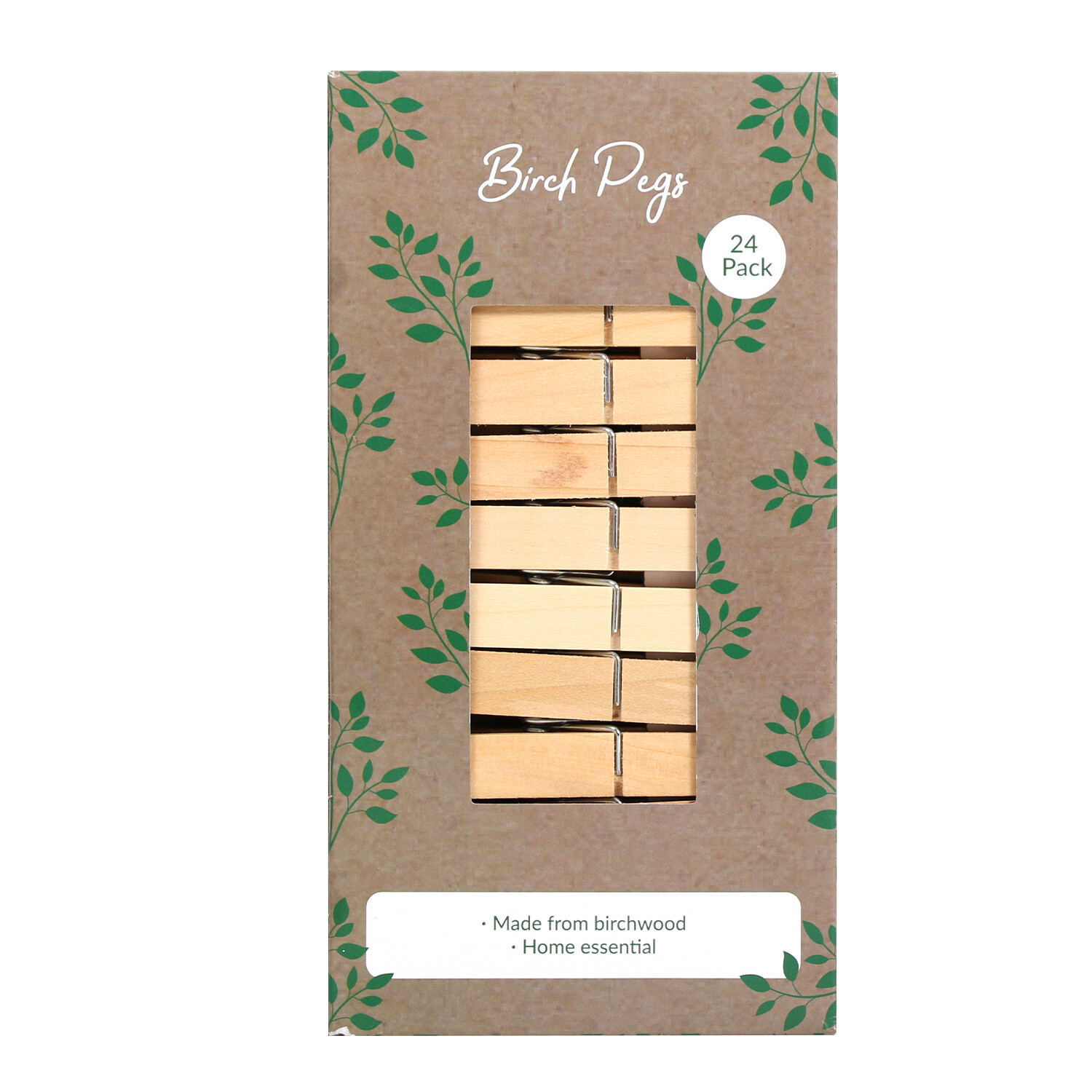 Hang up your clothes with ease with this Pack of 24 Birch Pegs. This one pack is enough to hang your load of washing and have all of your pegs perfectly coordinated. A great way to avoid using your tumble dryer, let your clothes air dry on the washing line with these durable pegs!
