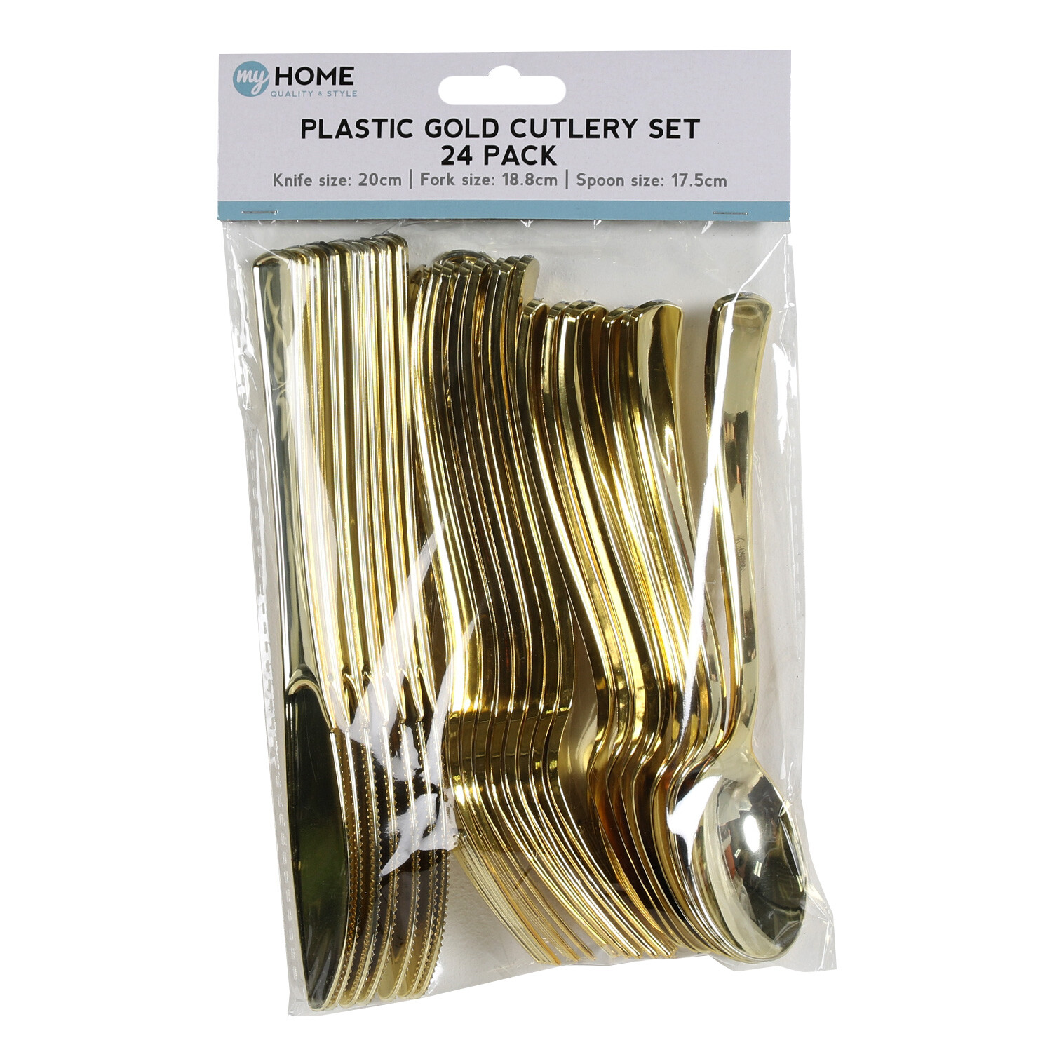 Jazz up your party or event with the help of the Pack of 24 Gold Plastic Cutlery Set. The cutlery is made from plastic to be both reusable and disposable for convenience and has a gold tone for a luxurious feel. The set includes knives, forks, and spoons and is suitable for most meals and desserts.