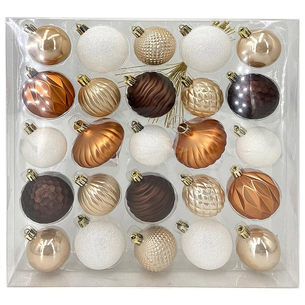 Make your tree look magical this Christmas and decorate it with this Pack of 25 Decadent Bronze Baubles. These stylish festive ornaments have been coloured in elegant, sumptuous tones of burnished bronze for a dazzling effect on your Christmas tree. Featuring traditional shapes with modern textured elements, these will be decorations you'll want to use each year.
