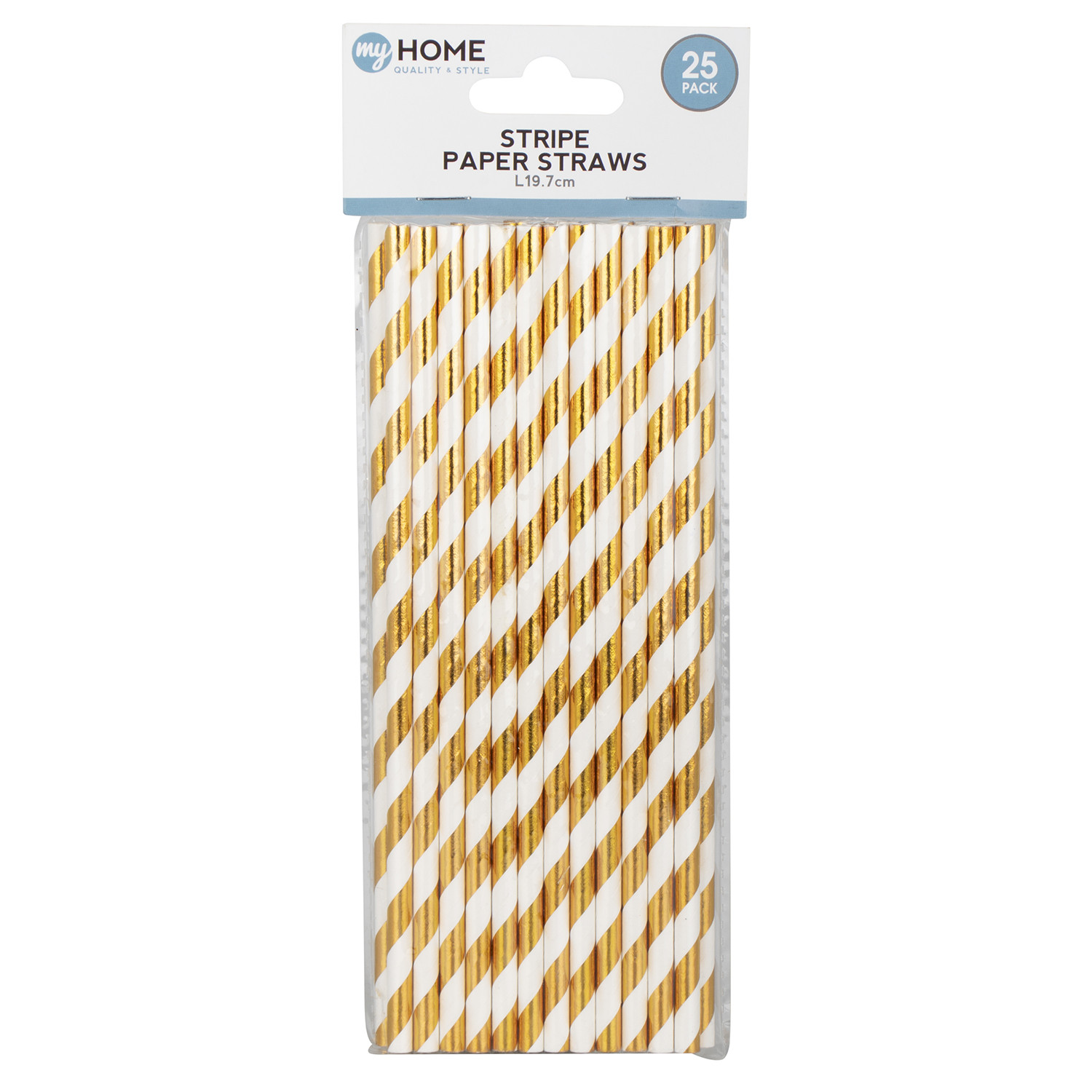 An eco-friendly alternative to plastic, this Pack of 25 Striped Paper Straws are coloured gold and silver, making them perfect for parties! With 25 in a pack, you'll have enough to go around a few guests, and they'll help save on the washing up afterwards.