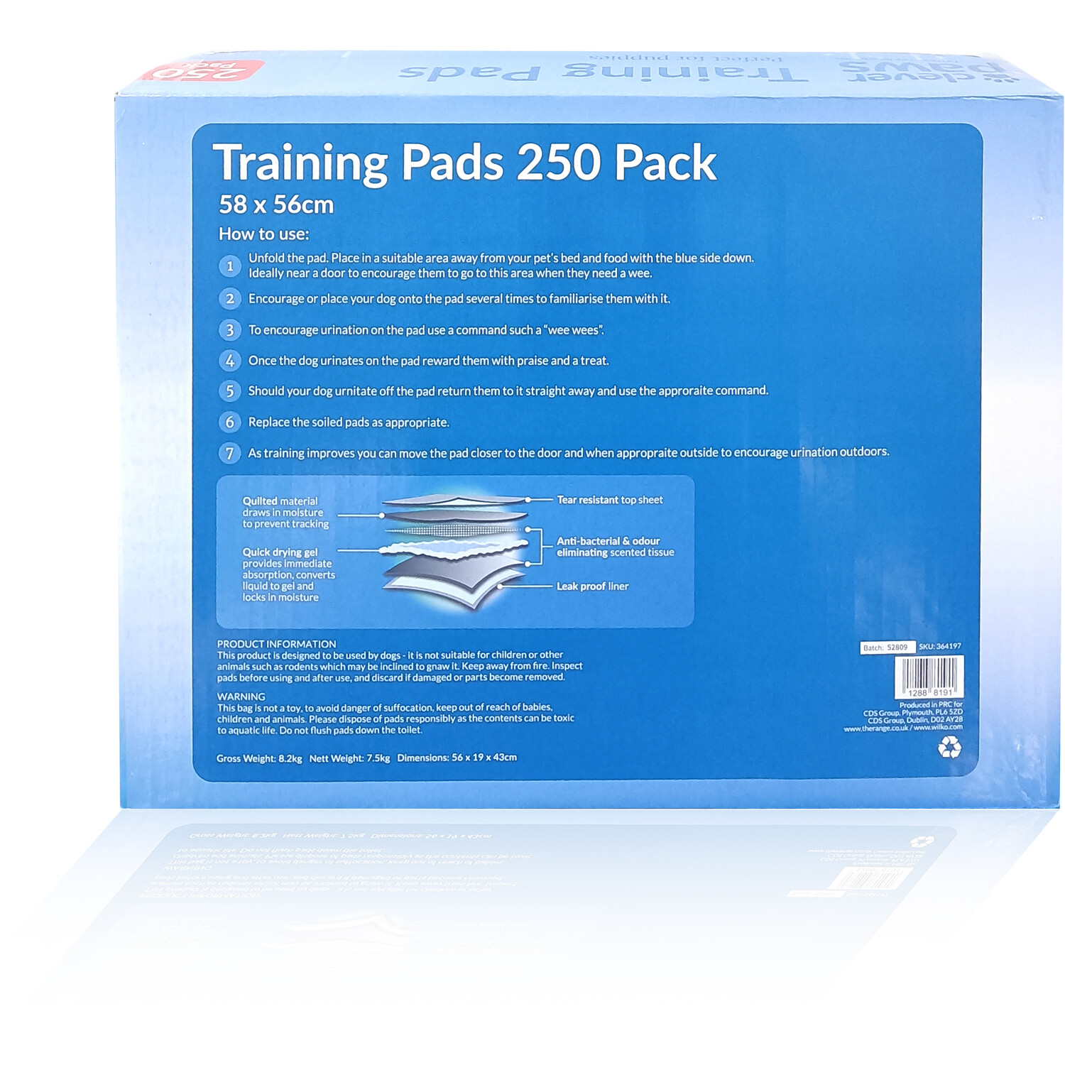 Train your pets without worrying about your floors with this pack of 250 Clever Paws Training Pads. These pads have a five-layer construction with a super-absorbent core that turns liquid into gel on contact. They absorb pets' urine and odour, creating a smell-free environment. The pads have a quick-dry surface with a leak-proof plastic lining that keeps floors safe from damage. They are ideal for indoor and outdoor use, these pads are suitable for puppy training, assisting senior dogs, or as an alternative when outdoor options are unavailable.