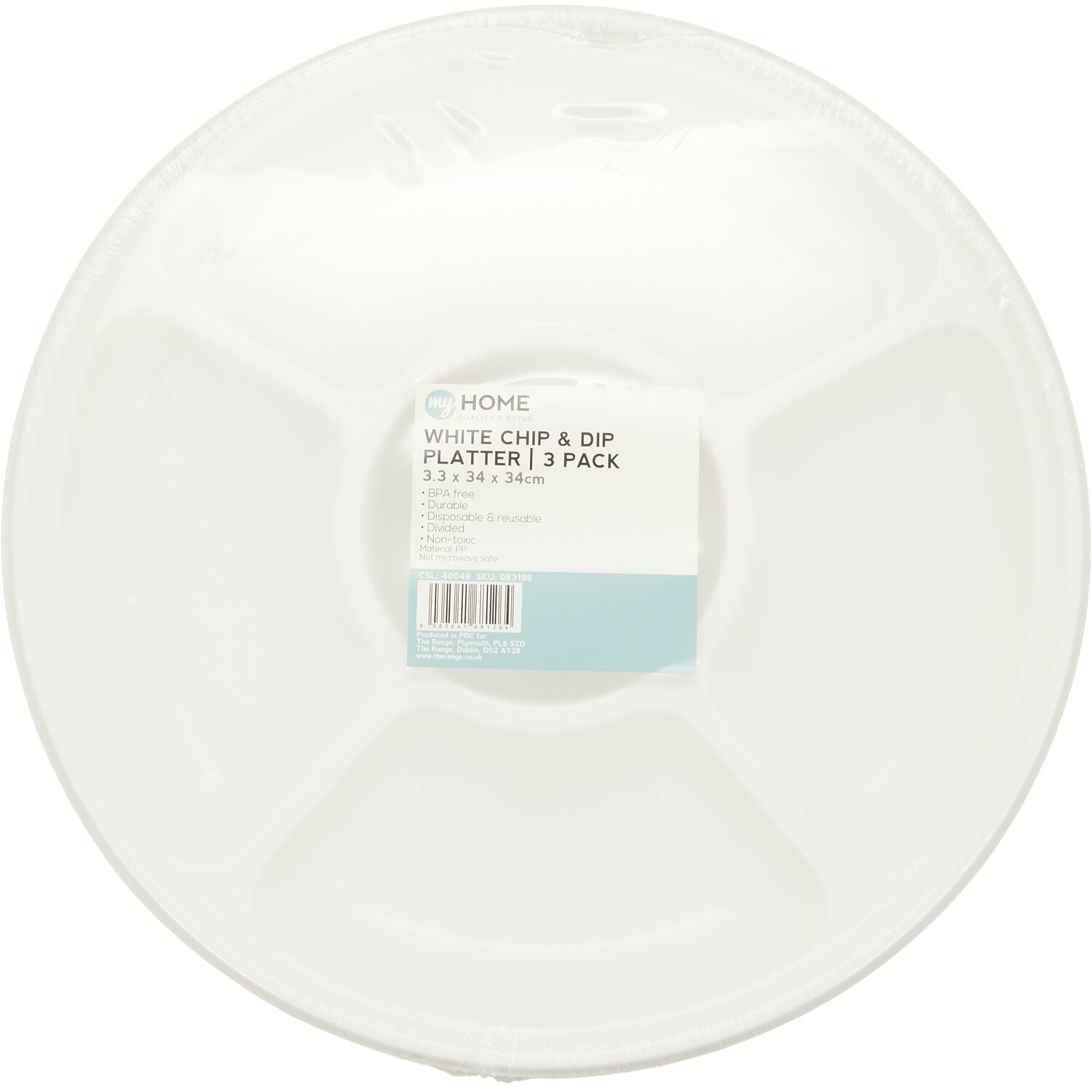 The Pack of 3 Chip and Dip Platters is the perfect serving dish for your next event. For birthday parties, garden parties, and BBQs, these platters allow you to serve delicious dips with chips and crudites. The platters are durable and reusable for convenience and will be a welcome part of any event.
