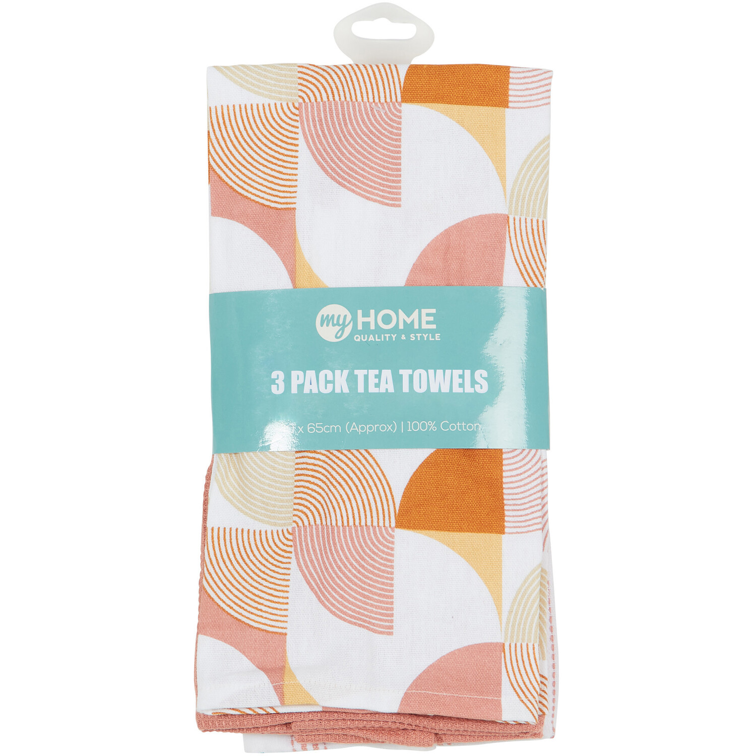 Brighten your kitchen with the Pack of 3 My Home Pink Geo Print Tea Towels. Featuring a modern geometric design, these towels are as stylish as they are practical. Made from high-quality fabric, they are highly absorbent and perfect for drying dishes or hands. Their cheerful print adds a homely touch to your space. Easy to wash, they are essential for any kitchen.