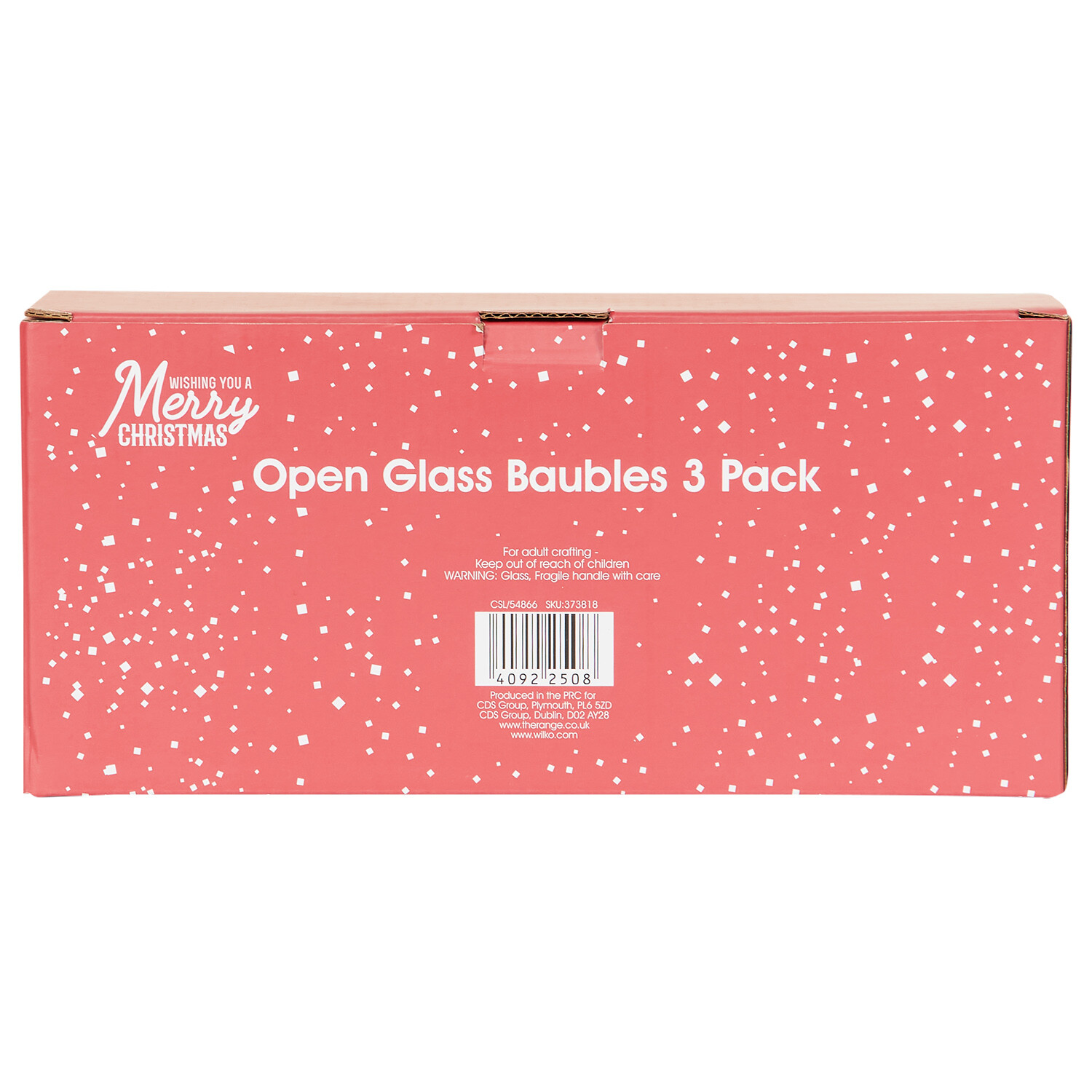Elevate your festive decor with a Pack of 3 Open Glass Baubles. These open glass baubles feature a balloon shape with round open cutting. The opening allows you to insert your favourite showpieces, whether a miniature Santa or other characters. The holder is moulted from the bauble, enabling the hassle of it breaking apart. You can also add small gifts or LED lights inside them.