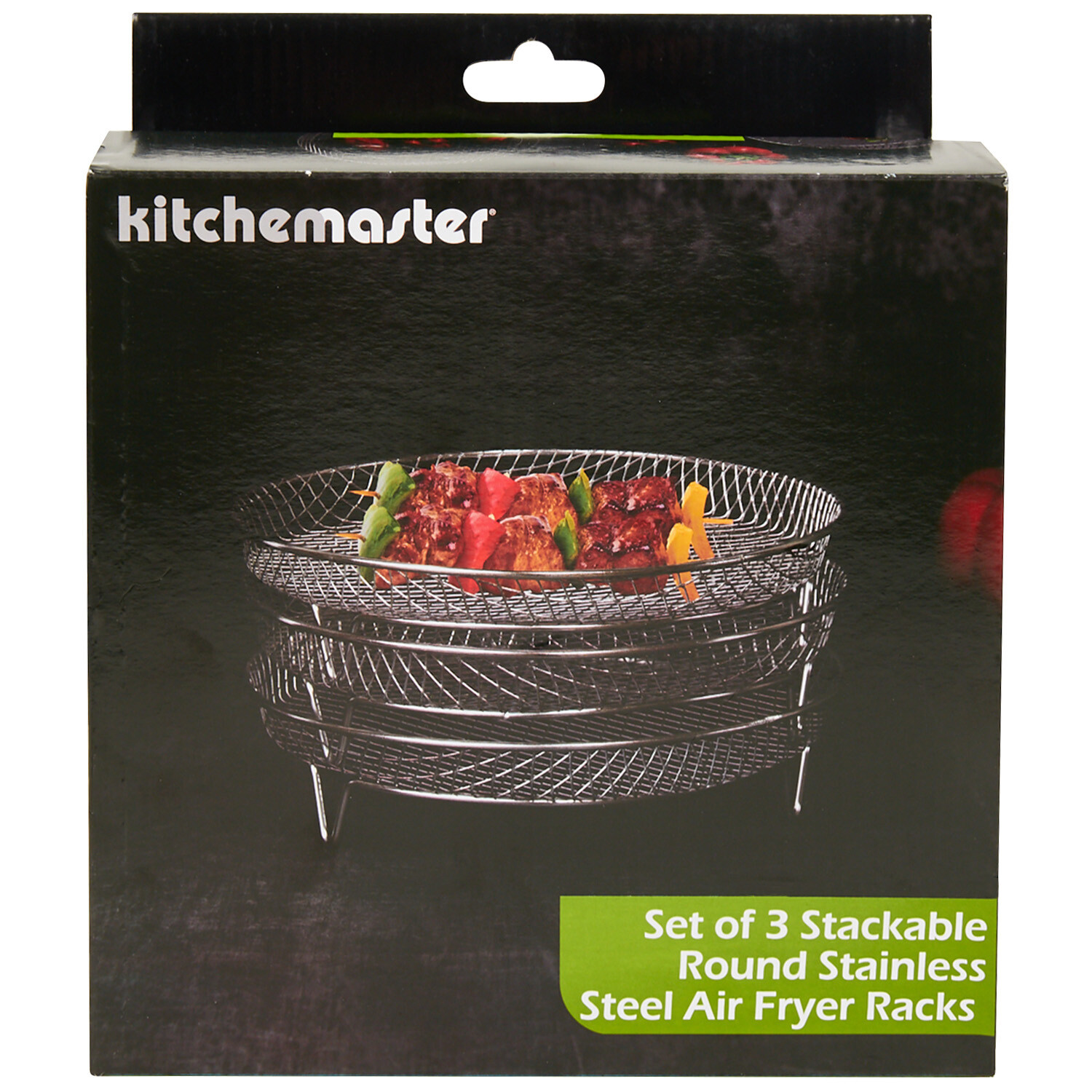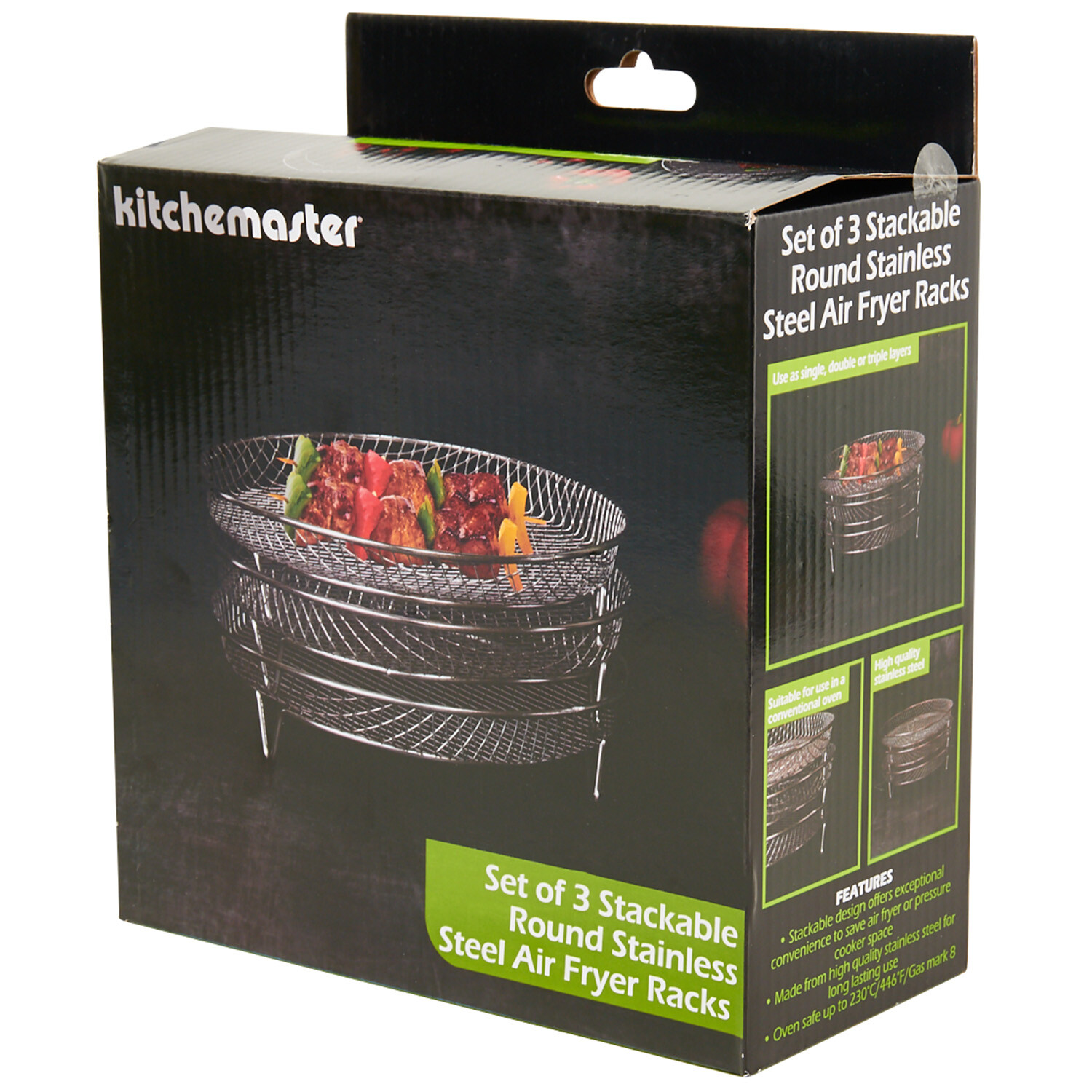 Maximise your cooking efficiency with the Pack of 3 Stackable Round Wire Air Fryer Racks. This set features a stackable design, allowing you to save space in your air fryer or pressure cooker. They can be used as single, double, or triple layers, depending on cooking needs. Made from stainless steel, these racks are durable and oven-safe up to 230 degrees Celcius (446°F/Gas mark 8). Suitable for both air frying and conventional oven use, they provide versatile and long-lasting convenience.