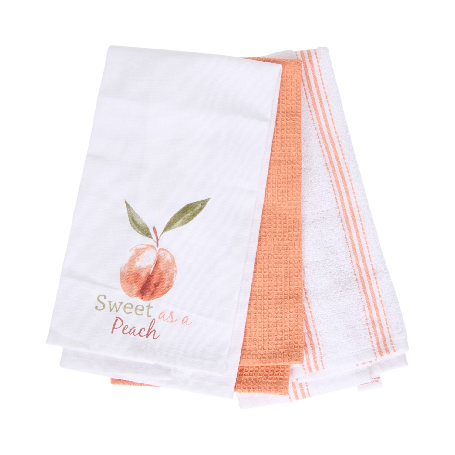 Add fruity flair to your kitchen with the Pack of 3 Sweet Peach Tea Towels. Adorned with a sweet peach design, these towels bring a dash of cheerful vibes to your space. They are crafted from 100% cotton to provide a soft feel and are ultra-absorbent to quickly dry hands, dishes, or kitchen surfaces.