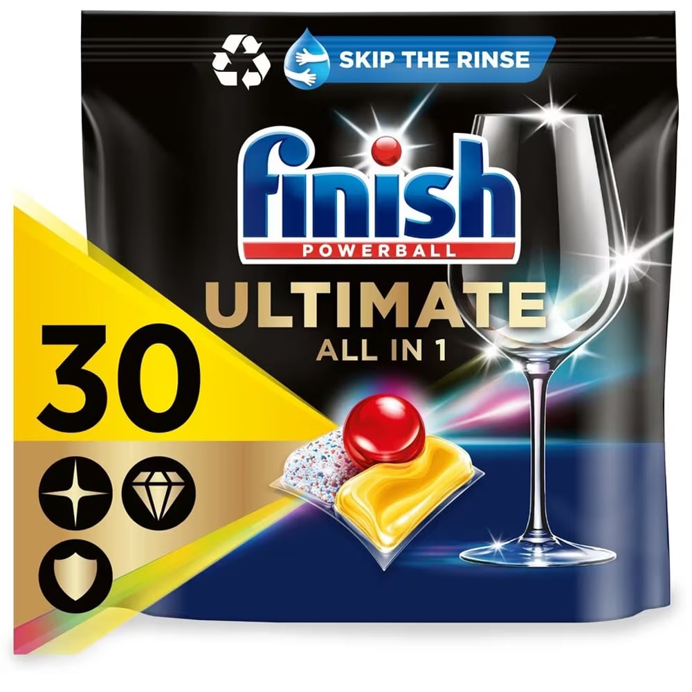 Finish Ultimate Dishwasher Tabs provides advanced cleaning on your dishes and glasses the first time, every time. The Finish Activelift Technology targets stubborn 48-hour dried-on stains without pre-rinse. They offer your dishes a diamond shine and come in recyclable packaging.