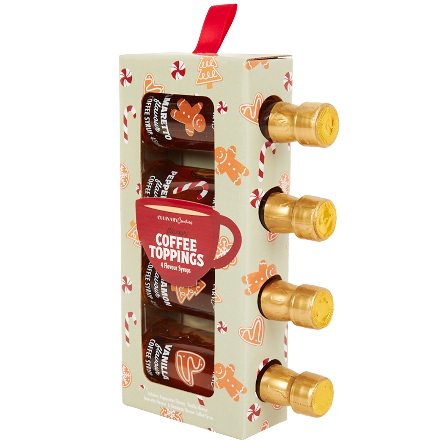 Give a festive touch to regular coffee with this Pack of 4 Coffee Toppings. This pack includes flavours like Peppermint, Vanilla, Amaretto and Cinnamon, making a delight for everyone. Ideal for both iced and hot coffees, add them to your mug for a tasty twist.