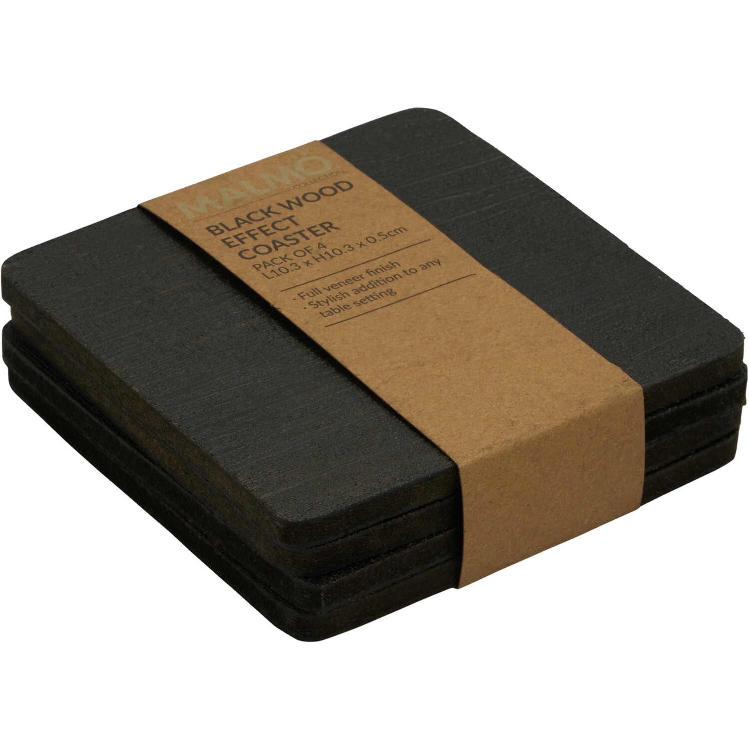 The Pack of 4 Malmo Coasters is a modern collection to bring style and sophistication to your dining or coffee tables. The coasters have a black painted wood-effect design for a fresh and modern feel, and they have a full veneer finish. They're ideal for protecting your table against heat damage and spills and are a stylish addition to any table setting.