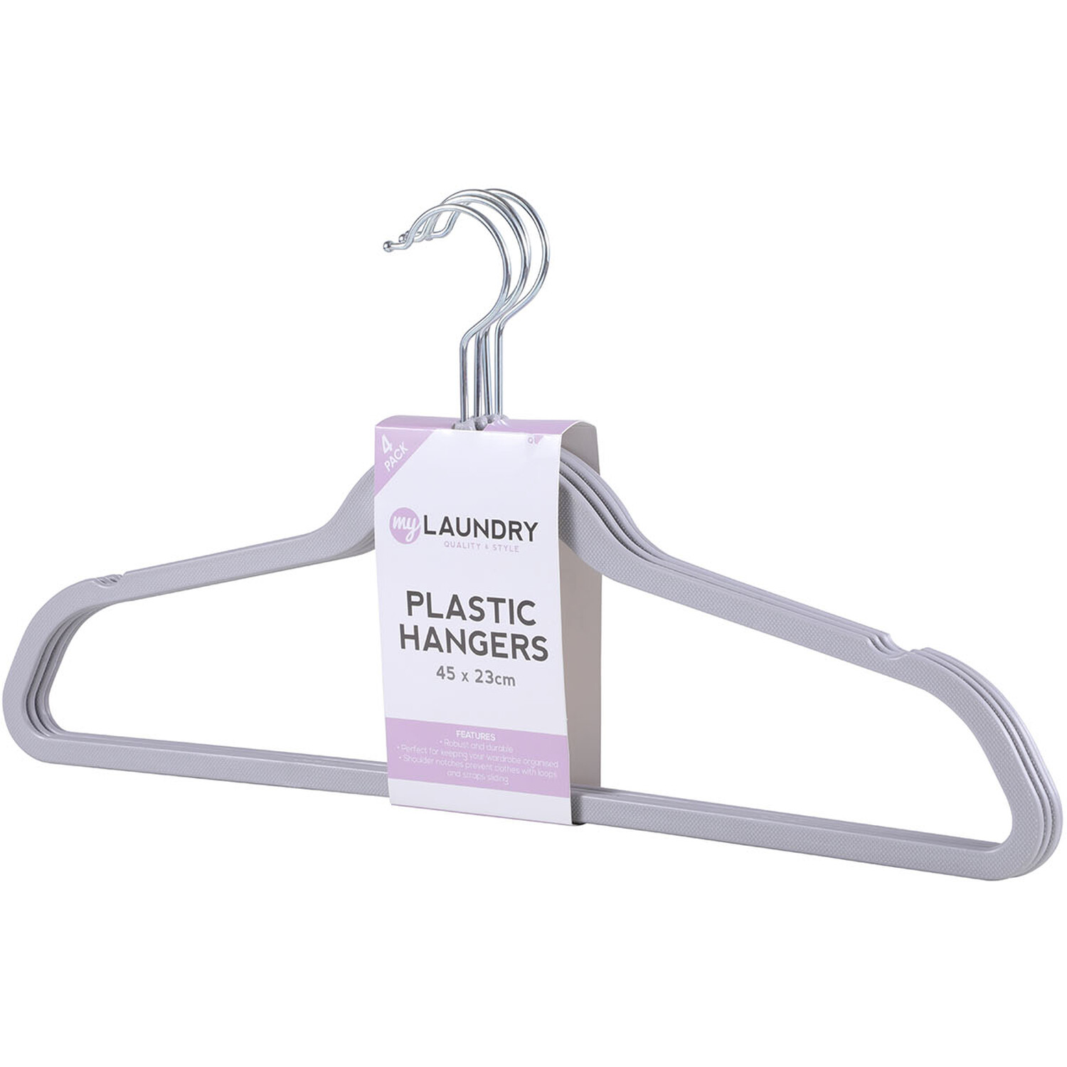 Organise your wardrobe with the Pack of 4 My Laundry Plastic Hangers. This set includes four grey plastic hangers, each featuring a secure metal hang-loop for easy hanging. They're perfect for all sorts of clothes, helping you keep everything organised and looking sharp. Great for daily use, these hangers are a smart and stylish choice for your wardrobe.