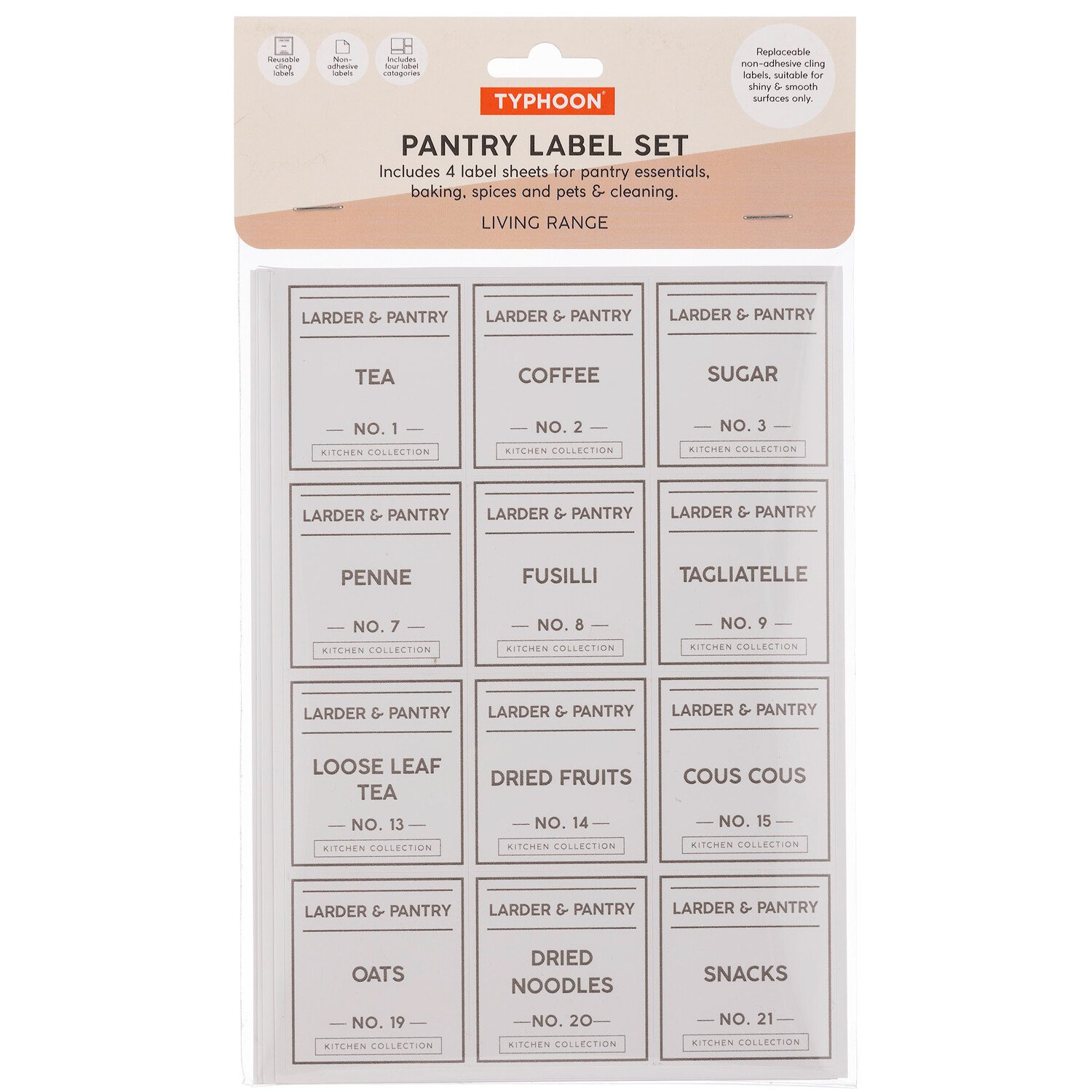 Enhance your pantry's organisation with the Pack of 4 Pantry Labels Sheets. These sheets feature 91 labels for a variety of categories such as baking, spices, laundry and pets. Made using a special, non-adhesive cling technology, each label is reusable as well as replaceable and has a white background to make the text stand out. Suitable for sticking onto shiny and smooth surfaces like glass and ceramic, these labels will make your kitchen orderly and aesthetically pleasing.