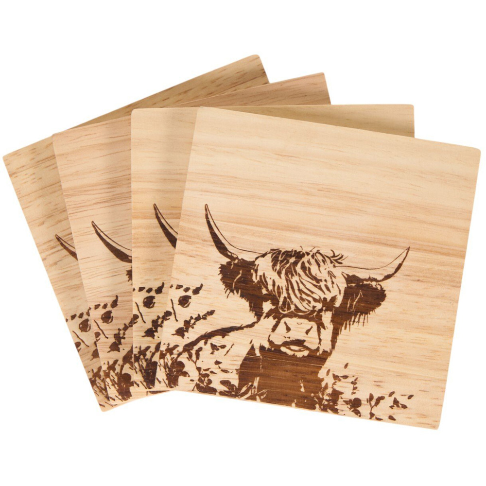 Enhance your table's appeal with the country charm of the Pack of 4 The Highland Cow Coasters. Featuring a beautiful highland cow print, these coasters showcase wood grains to add a rustic feel to any dining table. Designed to protect your table from water rings, they ensure your dining space stays neat and clean.