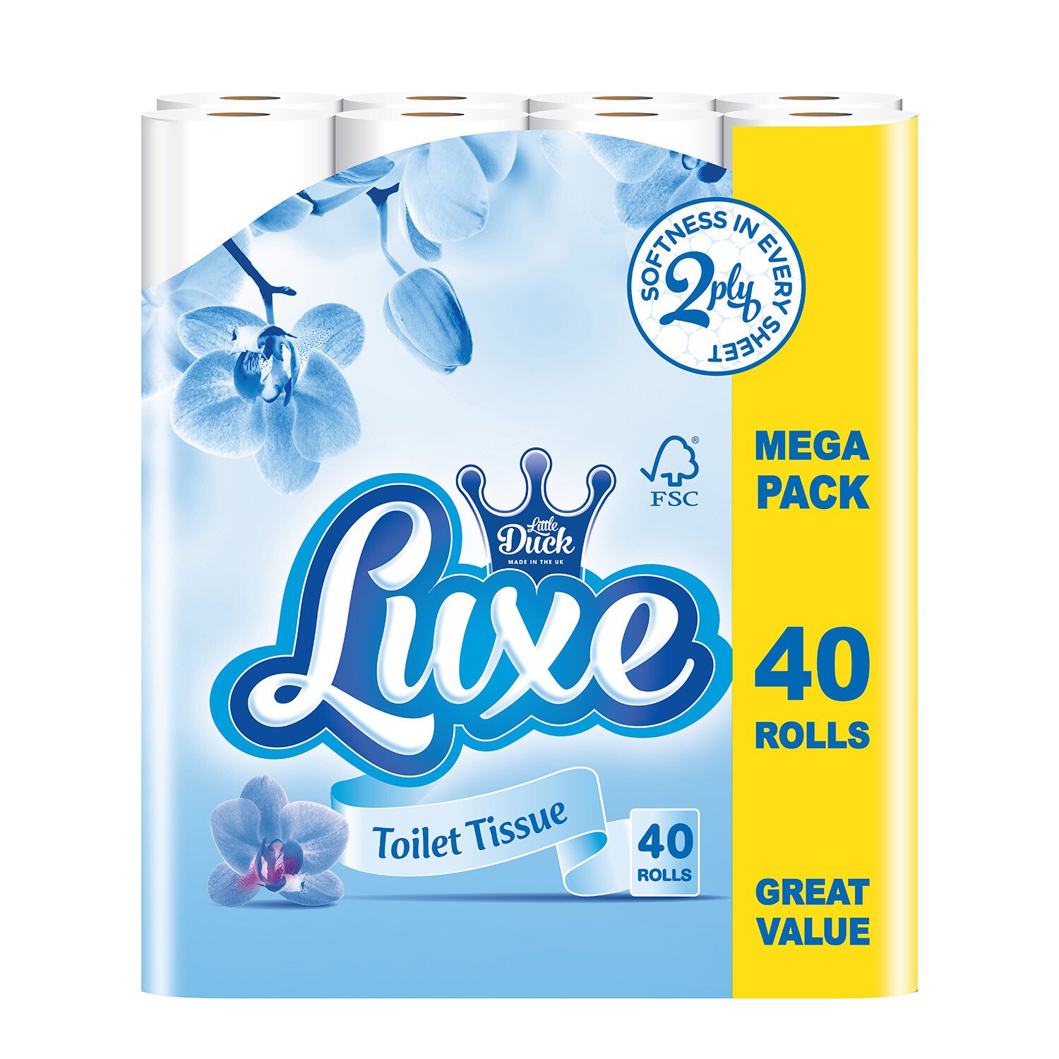 Enjoy comfort and quality with this Pack of 40 Little Duck Luxe Toilet Tissue 2 Ply. With 40 rolls included, this mega pack is perfect for a family and offers excellent value. Super soft, this embossed toilet tissue comes with a two-ply thickness for comfort and durability.