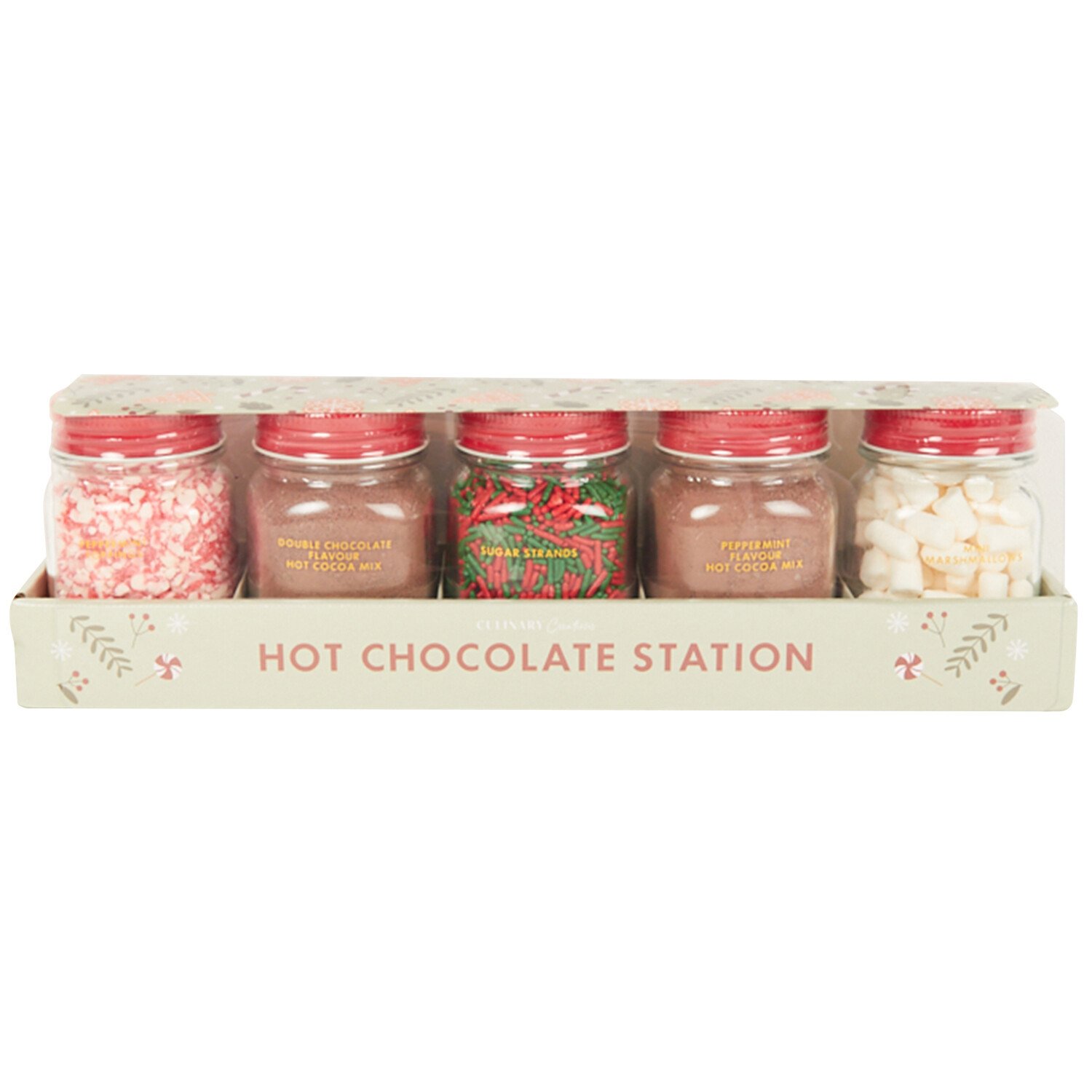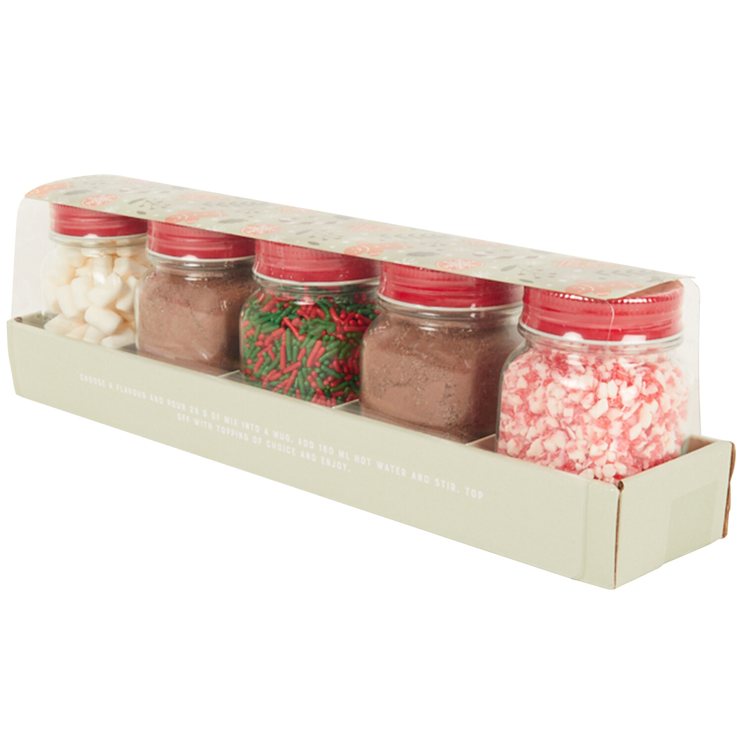 Create a festive hot chocolate experience with the Pack of 5 Hot Chocolate Station. This set includes five mini mason jars filled with crushed peppermint candy, double chocolate hot cocoa mix, green and red sprinkles, peppermint hot cocoa mix, and mini marshmallows. Perfect for adding a personalised touch to your winter beverages.
