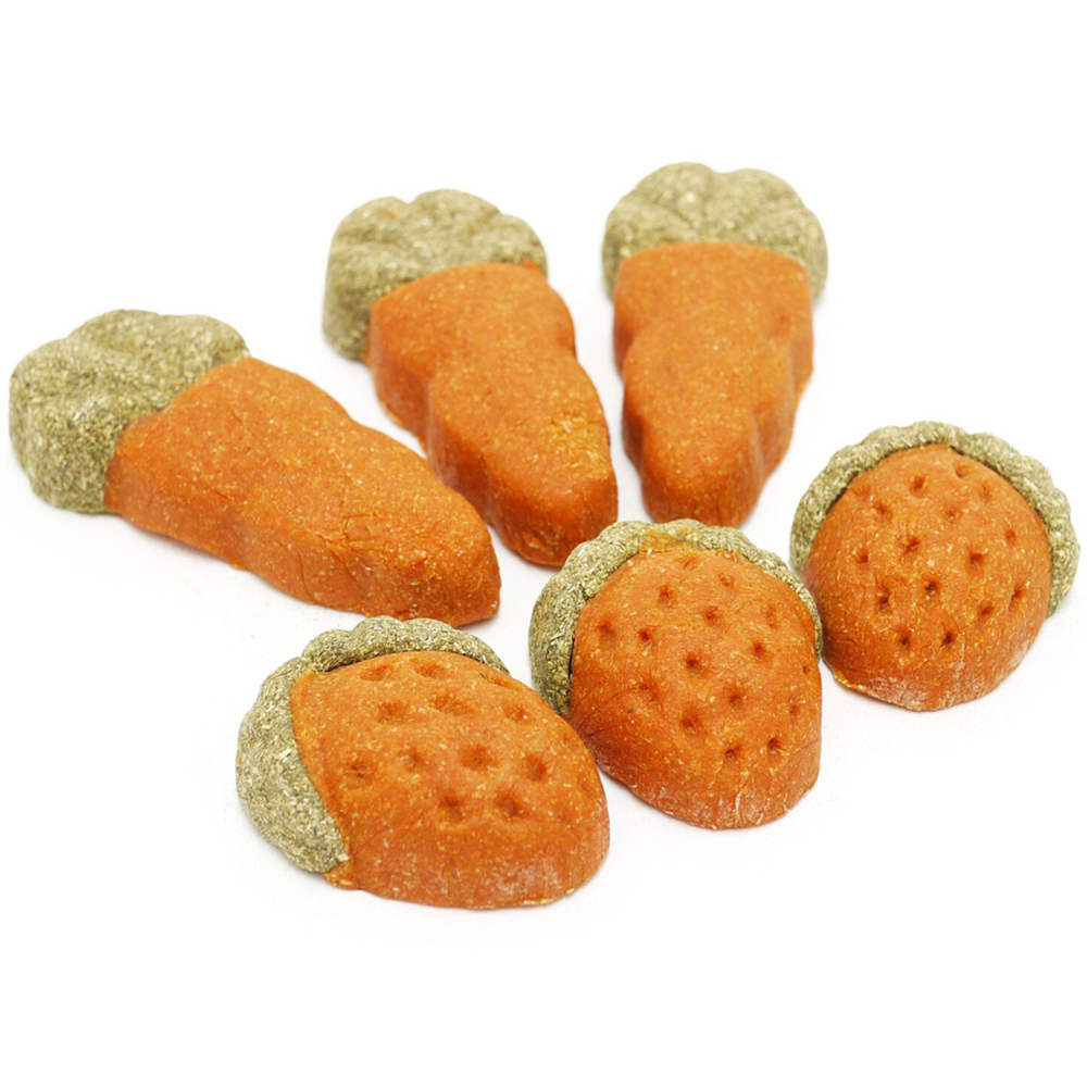 Our strawberries and carrots are treats that think they are gnaws! This Pack of 6 Gnawty N Nice Fruit and Veg is made from natural ingredients such as carrot, alfalfa and other vegetable-based ingredients; each treat is ultra-hard so it satisfies your pet's desire to gnaw. The varying sizes make them ideal for pets both small and larger. These treats last and last and are ideal for all rabbits, guinea pigs, hamsters, chinchillas and gerbils - can be offered to degus in strict moderation.